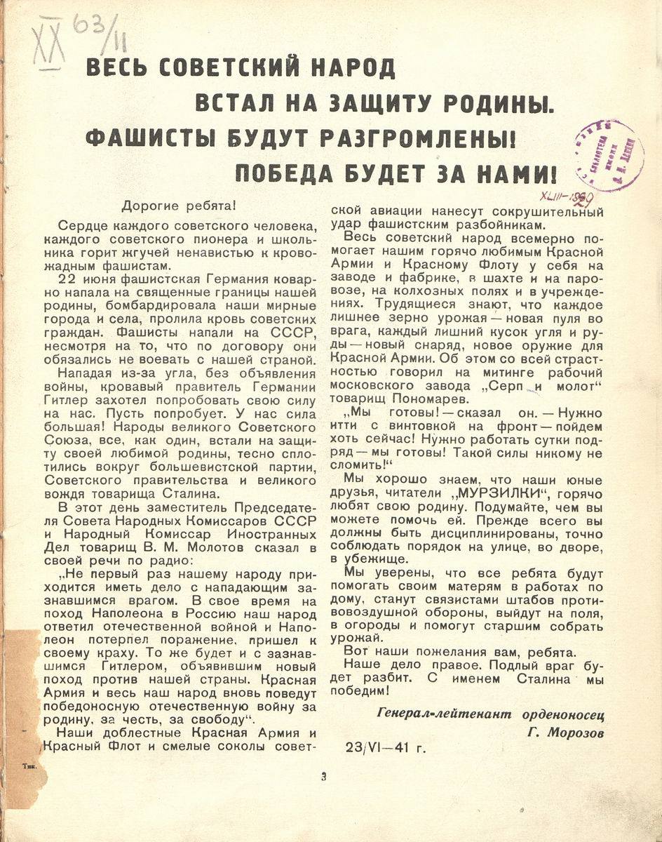 Старшее поколение помнит его очень хорошо. Журнал предназначался для детей от 4-х до 7 лет и очень быстро завоевал популярность. Трогательные истории о различных зверях и животных, истории сказочных персонажей - вот какой был журнал в довоенное время. С началом Великой Отечественной войны изменилась жизнь и коренным образом изменился и журнал. Исчез сказочный персонаж "Мурзилка". Он снова появится только после войны. Журнал стал рассказывать о том, как помогать своей стране, фронту, взрослым, ушедшим на фронт. Июльский номер журнала за 1941 год вышел с обращением генерал-лейтенанта Г. Морозова: «22 июня фашистская Германия напала на священные границы нашей Родины… Нападая из-за угла, без объявления войны, кровавый правитель Германии Гитлер захотел попробовать свою силу на нас. Пусть попробует. У нас сила большая!»