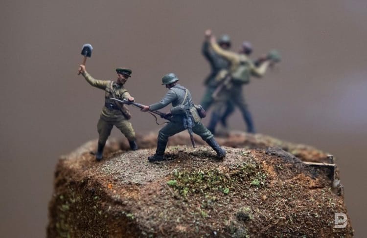 На выставке представлены картины и рисунки, которые художники-фронтовики создали в перерывах между боями и после войны. Также представлены исторические миниатюры и диорамы.