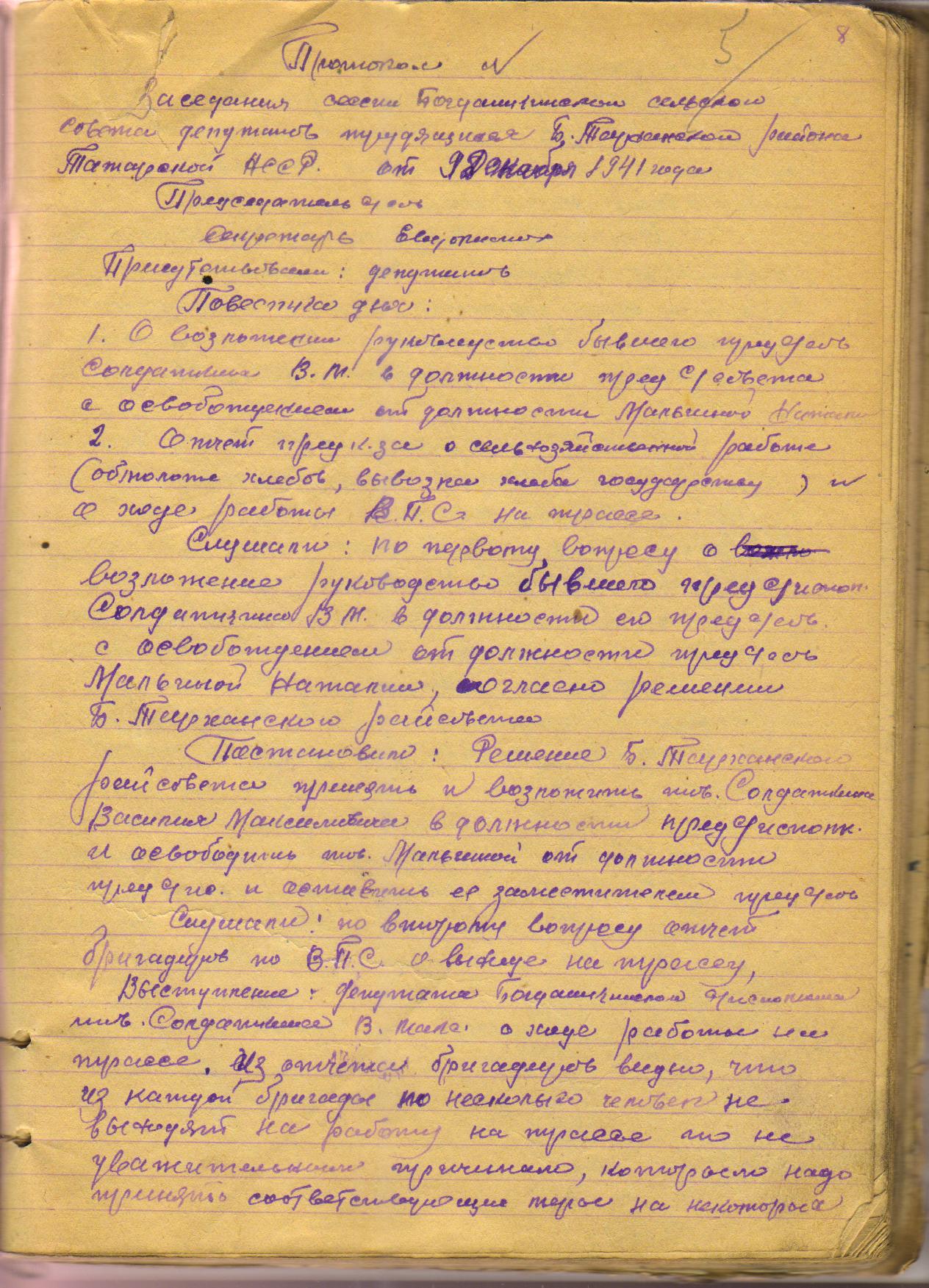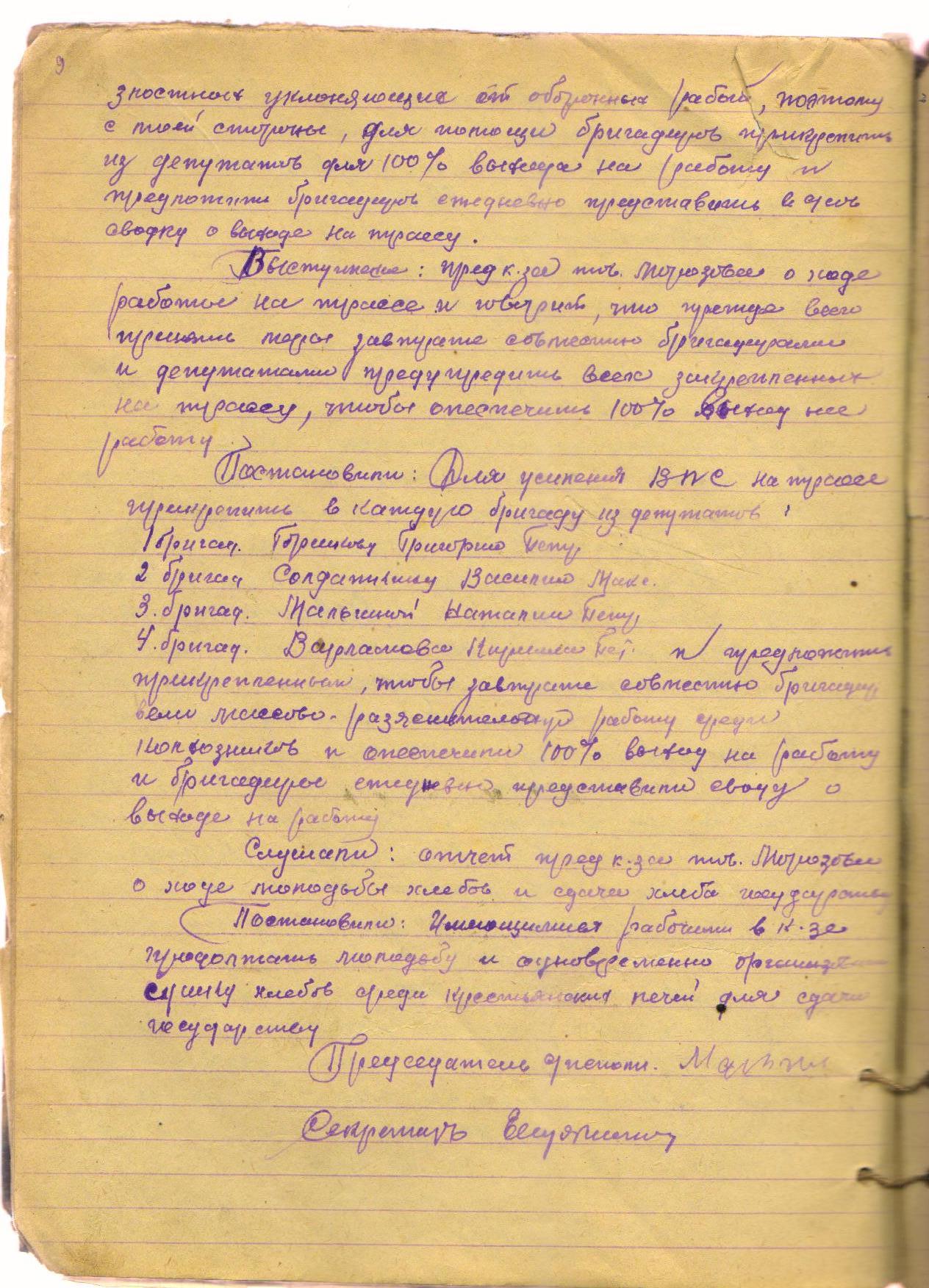 Постановили: Для усиления ВПС на трассе прикрепить в каждую бригаду депутатов. Прикрепленные депутаты должны вести массово-разъяснительную работу среди колхозников и обеспечить 100% выход на оборонную работу.