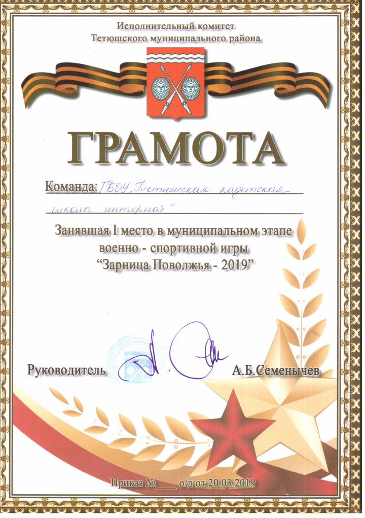 По итогам соревнований, команда Тетюшской кадетской школы-интерната (руководитель команды Костюнин С.А., командир Владимиров Р.), заняв I места в визитке «Равнение на Знамена», интеллектуальном конкурсе «Ратные страницы истории России», конкурсе «Хорош в строю, силен в бою», неполной разборке и сборке АК-74, ОБЖ, спортивном ориентировании на местности и силовой подготовке, признана Победителем.