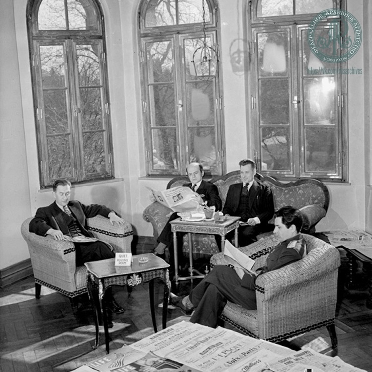 Советские журналисты на Нюрнбергском процессе над главными военными преступниками. Слева направо: Б.В. Афанасьев, М.С. Гус, Д.Ф. Краминов, П.И. Трояновский