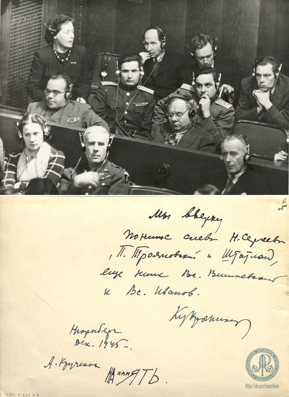 Советские журналисты, художники и кинооператоры на Нюрнбергском процессе. В первом ряду (за ограждением), слева направо: В.В. Вишневский, В.В. Иванов; во втором ряду (слева направо): Н.А. Сергеева, П.И. Трояновский, В.А. Штатланд; в третьем ряду (слева направо): Н.А. Соколов, П.Н. Крылов, М.В. Куприянов (Кукрыниксы). Декабрь 1945 г.