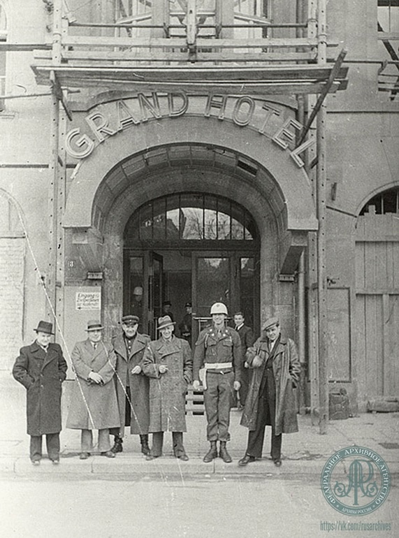 Советские писатели и журналисты у «Гранд-отеля» в Нюрнберге. Второй слева – В.В. Вишневский, третий слева – кинорежиссер Р.Л.Кармен.