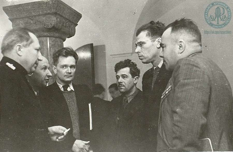 В кулуарах Нюрнбергского процесса. Слева направо: Главный обвинитель от СССР Р.А. Руденко, советские художники и журналисты – П.Н. Крылов, Н.А. Соколов, С.И. Кирсанов, М.В. Куприянов, В.В. Вишневский.