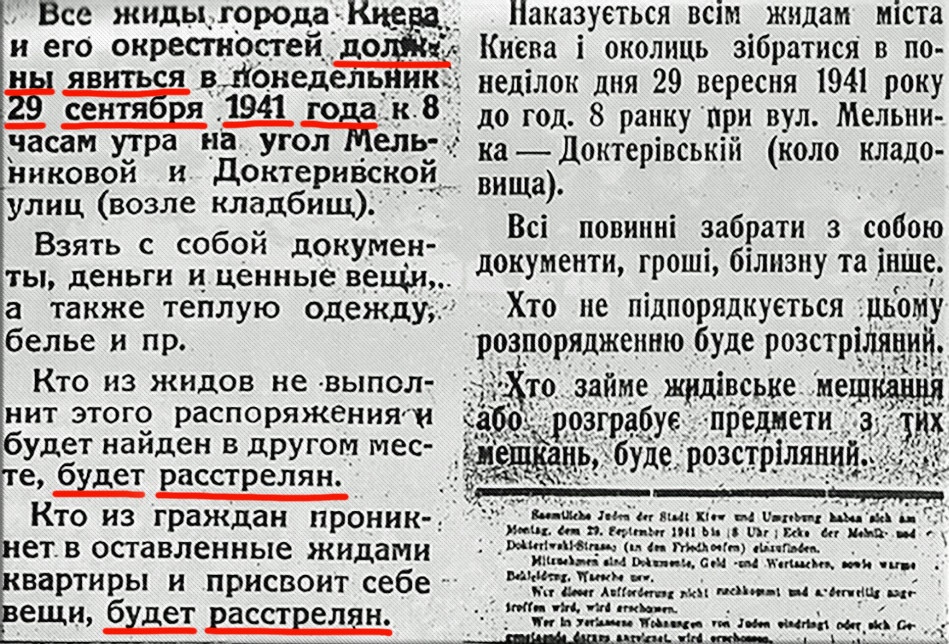 🗓 27 сентября по всему городу были расклеены объявления, в которых всем евреям Киева предписывалось утром 29 сентября явиться на угол Мельниковской и Дохтуровской улиц. При себе они должны были иметь документы, тёплые вещи и ценности. Не исполнившим приказ грозил расстрел.