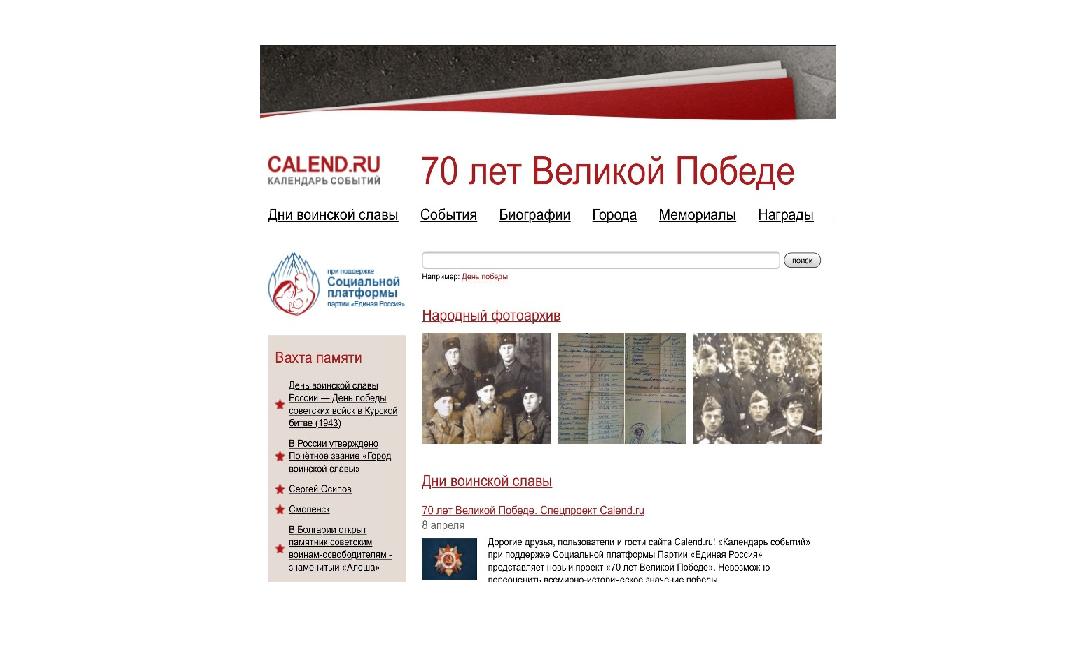 «Календарь событий» при поддержке Социальной платформы Партии «Единая Россия» представляет новый проект «70 лет Великой Победе». Невозможно переоценить всемирно-историческое значение победы нашего народа над фашизмом в Великой Отечественной войне 1941–1945 годов. Сегодня, когда остается все меньше живых свидетелей тех событий, мы должны ещё бережнее сохранять память о минувшей войне и передавать ее будущим поколениям, чтобы не допустить попытки переписать историю, не дать принизить подвиг советских солдат и офицеров, героев-подпольщиков и тружеников тыла. Заместитель Председателя Госдумы, замсекретаря Генсовета партии «Единая Россия» и координатор Социальной платформы партии Сергей Железняк отметил: «В преддверии Дня Победы этим проектом мы напоминаем, что общая большая Победа складывалась из ежедневных преодолений и побед наших доблестных воинов и тружеников тыла, побед тех, кто отдал свою жизнь за то, чтобы отстоять наше право свободно жить на родной земле. Проект поможет еще раз отдать дань памяти участникам Великой Отечественной войны, погибшим и выжившим в той страшной войне. Пока мы помним своих героев и чтим свою историю, мы остаемся сильной нацией, способной выдержать любые испытания. Социальная платформа партии «Единая Россия» поддерживает запуск проекта «70 лет Великой Победы», который усилиями энтузиастов-разработчиков, объединивших современные технологии и исследовательскую работу, даст еще одну возможность сохранить память о наших героических предках». Сегодня мы должны ещё бережнее сохранять память о минувшей войне и передавать ее будущим поколениям... (Фото: Popova Valeriya, Shutterstock) Сегодня мы должны ещё бережнее сохранять память о минувшей войне и передавать ее будущим поколениям... (Фото: Popova Valeriya, Shutterstock) На протяжении нескольких лет редакция сайта собирала материал по периоду Великой Отечественной войны. В этом году мы провели анализ контента и дополнили каждый раздел, стремясь представить полную картину событий. В результате родилась концепция, которая позволяет каждому человеку не только прочитать о событиях тех дней, но и внести свой маленький вклад в сохранение народной памяти, загрузив фото из семейного архива. Проект не закончится праздничными днями, мы будем его дополнять постоянно. В проекте более двухсот статей, представленных в разделах о Днях воинской славы России, о ключевых событиях Великой Отечественной войны, о городах-Героях и городах Воинской славы, о людях, обеспечивших Победу, мемориалах памяти и военных наградах. Важнейший раздел проекта – «Народный фотоархив». Война оставила отпечаток в истории каждой семьи в нашей стране. Мы приглашаем всех, кому дорога семейная история, принять участие в проекте, и рассказать о своих родных – тех, кто воевал на фронтах Великой Отечественной и самоотверженно работал в тылу; кто помогал Победе, участвуя в подпольном и партизанском движении; о тех, чье детство поглотила война, а юность – послевоенная разруха и голод. Загружайте фотографии из семейных архивов, ведь каждая фотография – это документальное свидетельство тех лет.