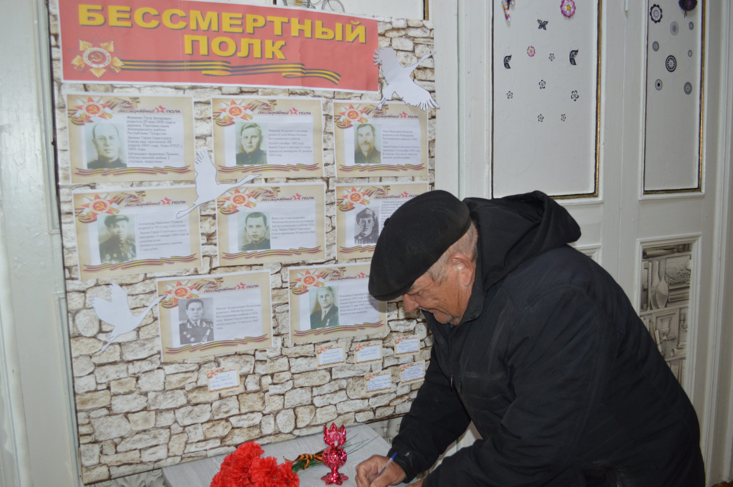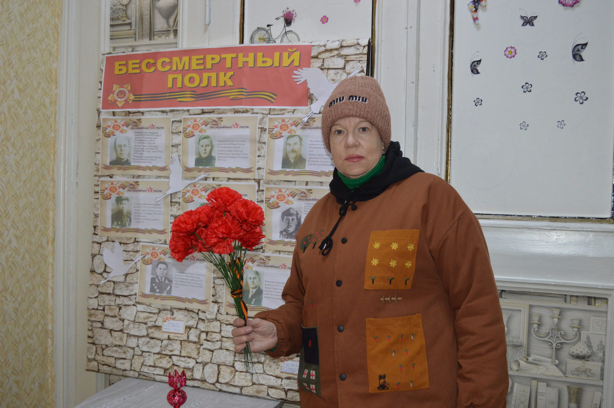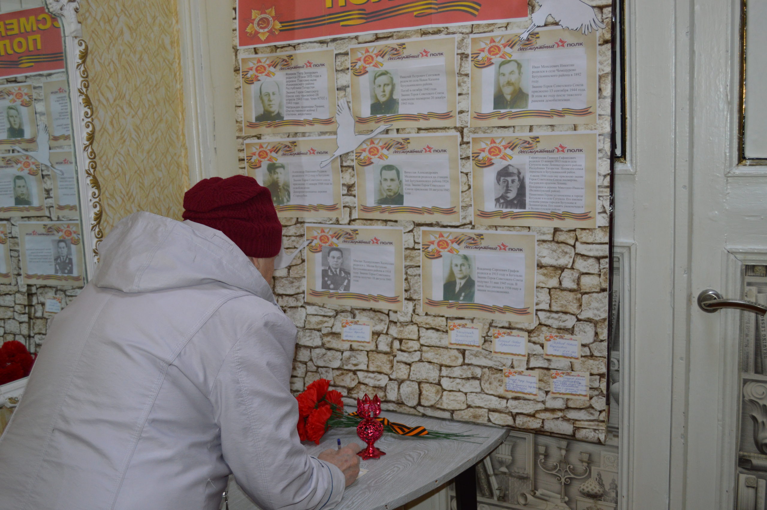 "Бессмертный полк" — это уникальная всемирная патриотическая акция в память о жертвах и участниках Великой Отечественной войны, которая впервые появилась в России. В честь дня великой Победы нашей Родины в Великой Отечественной войне к этой акции присоединится и наша библиотека, которая организует свой «Бессмертный полк» в стенах библиотеки.. Сотрудники, читатели и жители смогли поделиться фотографиями, материалами и рассказами о своих родных, воевавших на фронтах Великой Отечественной и разместить карточки с их именами на нашей стене памяти.