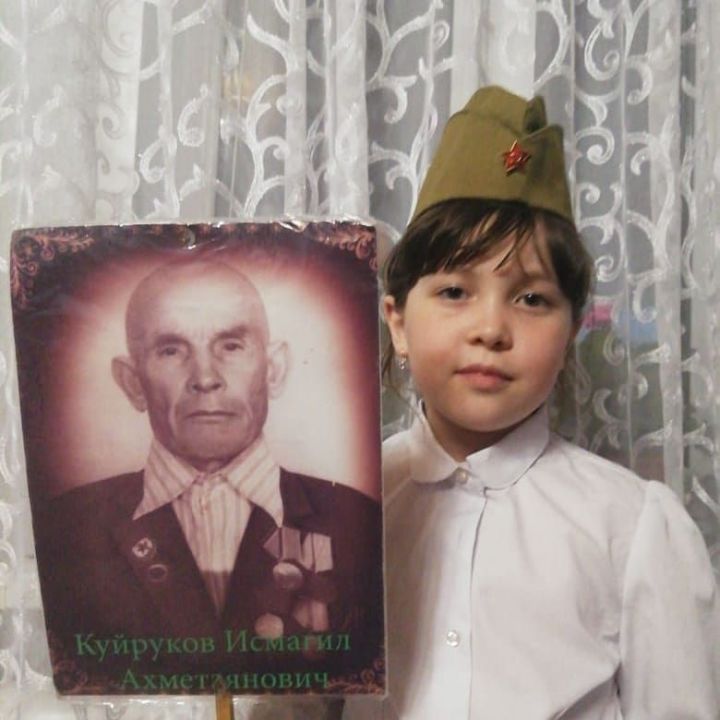 "Мой прадедушка Куйруков Исмагил Ахметзянович, родился в 1911 году. В 1942 году ушёл на Великую Отечественную Войну, и вернулся с победой. Во время войны был наводчиком, ходил на танках, служил младшим сержантом. Награждён медалью, "За отвагу". Во время войны мой прадедушка носил фамилию Кайруков, по возвращении с войны носил фамилию Куйруков. И до самой смерти не считался ветеранов Великой Отечественной войны. Звание ветерана Великой Отечественной войны было присвоено, только после его смерти. По возвращении с войны работал в колхозе, затем в милиции на конюшне, на милицейском комбинате, после выхода на пенсию водил лошадь в сельпо, перевозил товары. Умер в возрасте 80 лет, в 1992 году. Спасибо деду за Победу!"