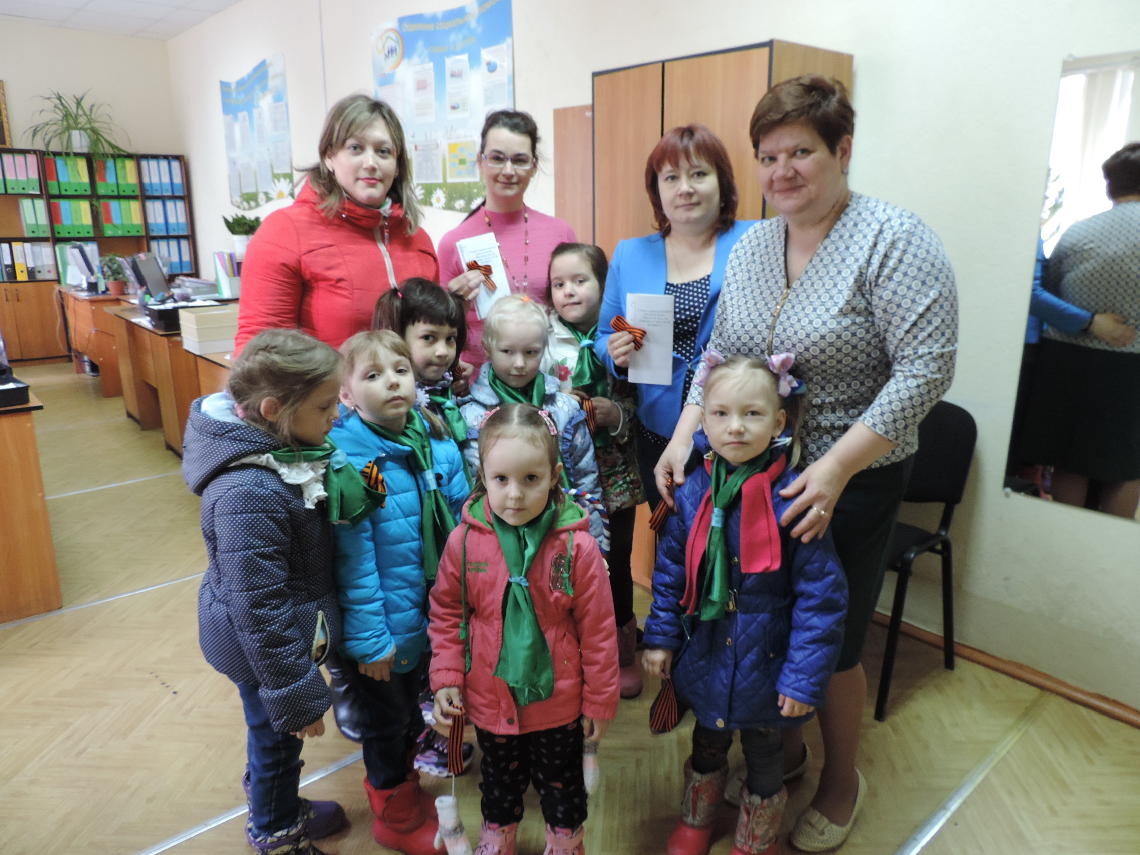 25 апреля педагог – организатор МБУ «Центр «Форпост» провела с воспитанниками МБДОУ «Детский сад «Березка» акцию «Георгиевская ленточка». В ходе беседы рассказывалось о том, почему эта ленточка имеет такое название, о том, что цвета ленты черный и оранжевый означают «дым и пламя» и являются знаком личной доблести солдат на поле боя. Дети сделали украшение для Георгиевской ленточки в виде цветочка, отправились по детскому саду и прикрепляли ленточки сотрудникам. Затем вышли на улицу и раздавали ленточки прохожим.