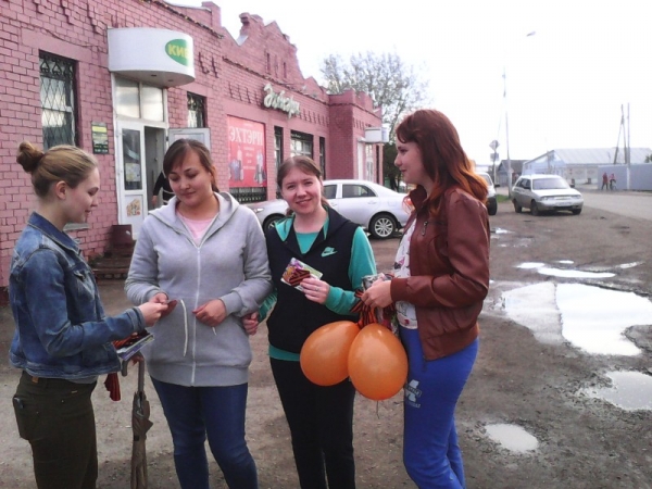 Волонтеры Центра добровольчества «Ключ» вместе с ленточками вручали жителям и гостям поселка поздравительные открытки, пожилым людям гвоздики, сделанные своими руками, а детям – шарики.