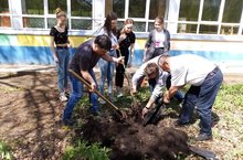 Совместно с директором школы Осиповым Н. И. председатель ППО Рахимов Р. М., учитель биологии Каримова Г. Р., ремонтник по обслуживаю здания Кичатов Р. О. и учащиеся 10а класса СОШ №22 на школьном участке посадили яблони и груши.