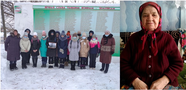 «Родилась в 1931 году. В семье было 6 детей (3 сестры и 3 брата). Работала в колхозе. Не закончила даже 1 класса. Заболели глаза. Старший брат (1923 г.) Федор, его забрали на фронт, где и погиб. Брат (1925 г.) – Гурьян тоже погиб.