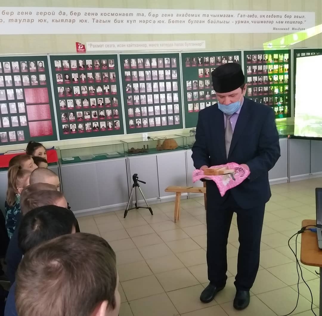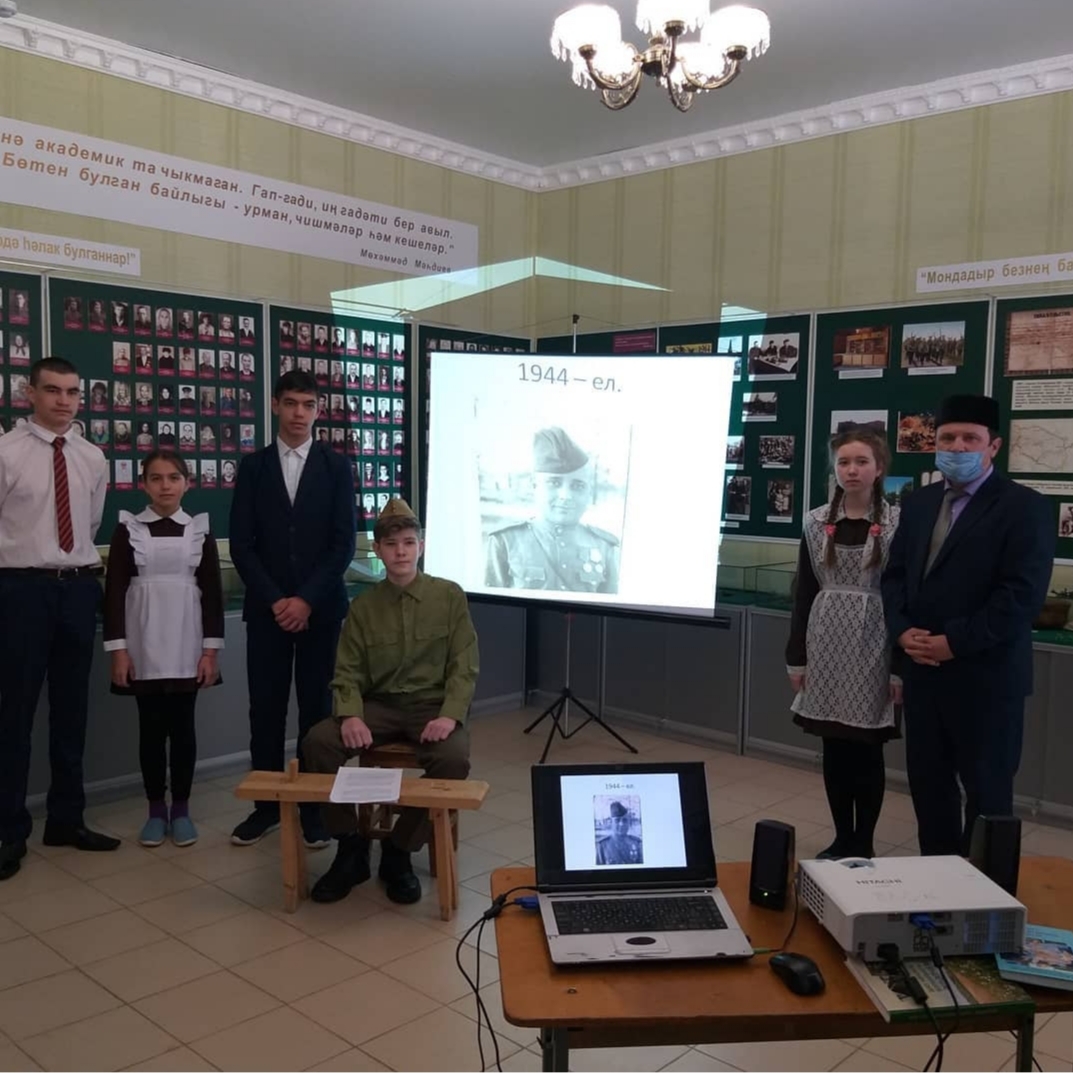 Далее усилиями краеведческого кружка «Мирас» было показано театрализованное действие о судьбе и о боевом пути Махмутова Ахмета Махмутовича (1916-1945). Учащиеся прочитали все 7 писем бойца, которые сохранили родные и близкие Ахмет Махмутовича. Показана презентация, где были показаны фотографии Махмутова и его близких людей, фрагменты писем, копии наградных листов, орден и медали которыми был награжден солдат. Примечательно то, что последнее письмо было написано 13 марта 1945 года. А 14 марта 1945 года Махмутов Ахмет Махмутович пал смертью героев в Польше.