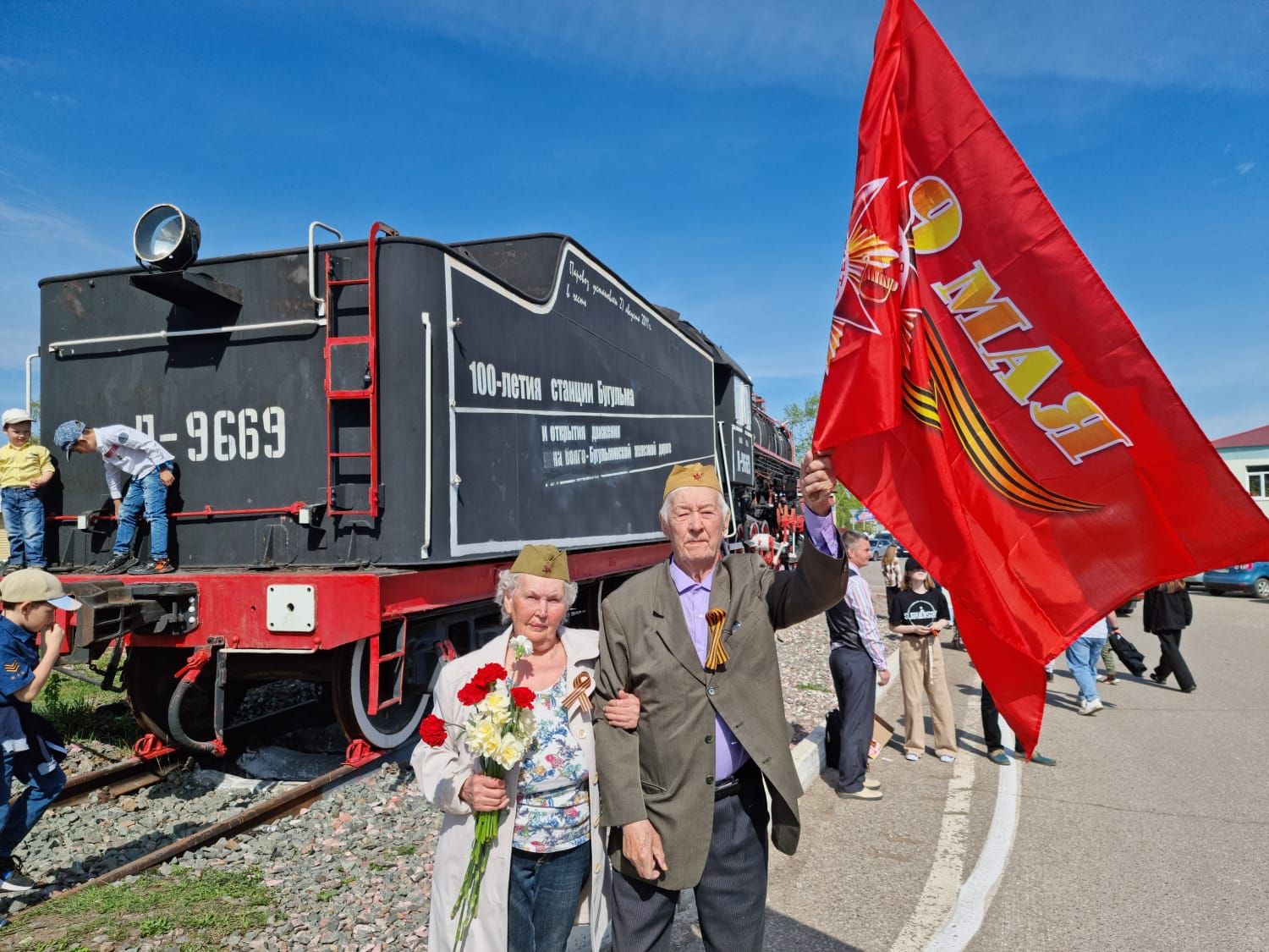 Встретить «Паровоз Победы» пришло огромное количество бугульминцев и жителей соседних городов. Люди пришли с праздничными шарами, портретами своих предков, которые воевали в Великую Отечественную войну, многие взрослые и дети были тематически одеты.