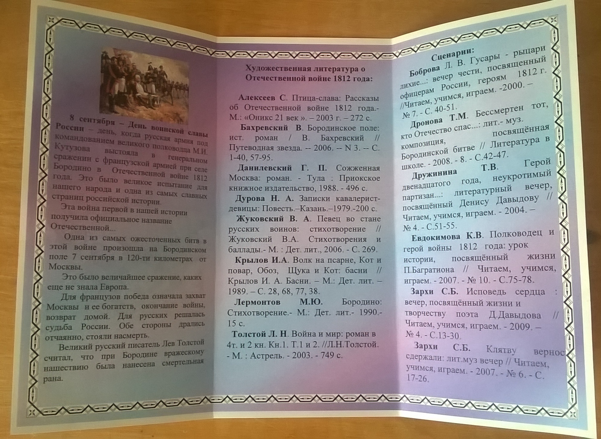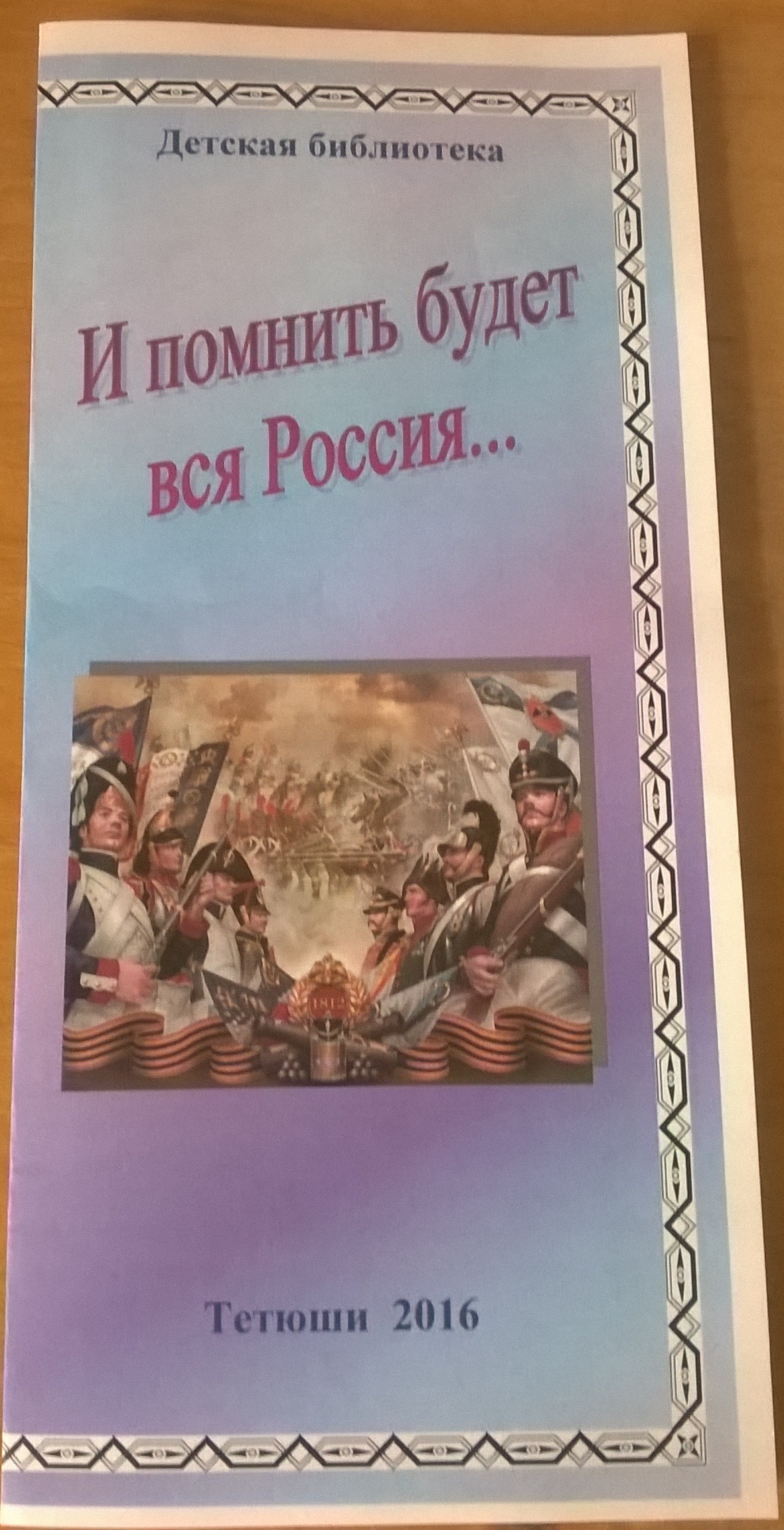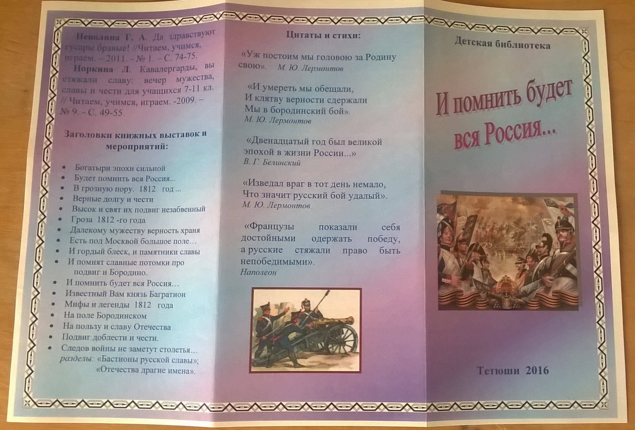 Ко Дню воинской славы России, который отмечался 8 сентября, в Детской библиотеке подготовлен буклет «И помнить будет вся Россия…». В нем содержатся методические материалы в помощь проведению мероприятий, посвященных Великой Отечественной войне 1812 года (заголовки книжных выставок, цитаты и высказывания, список сценариев и художественных произведений). Буклет распространен среди руководителей детского чтения.