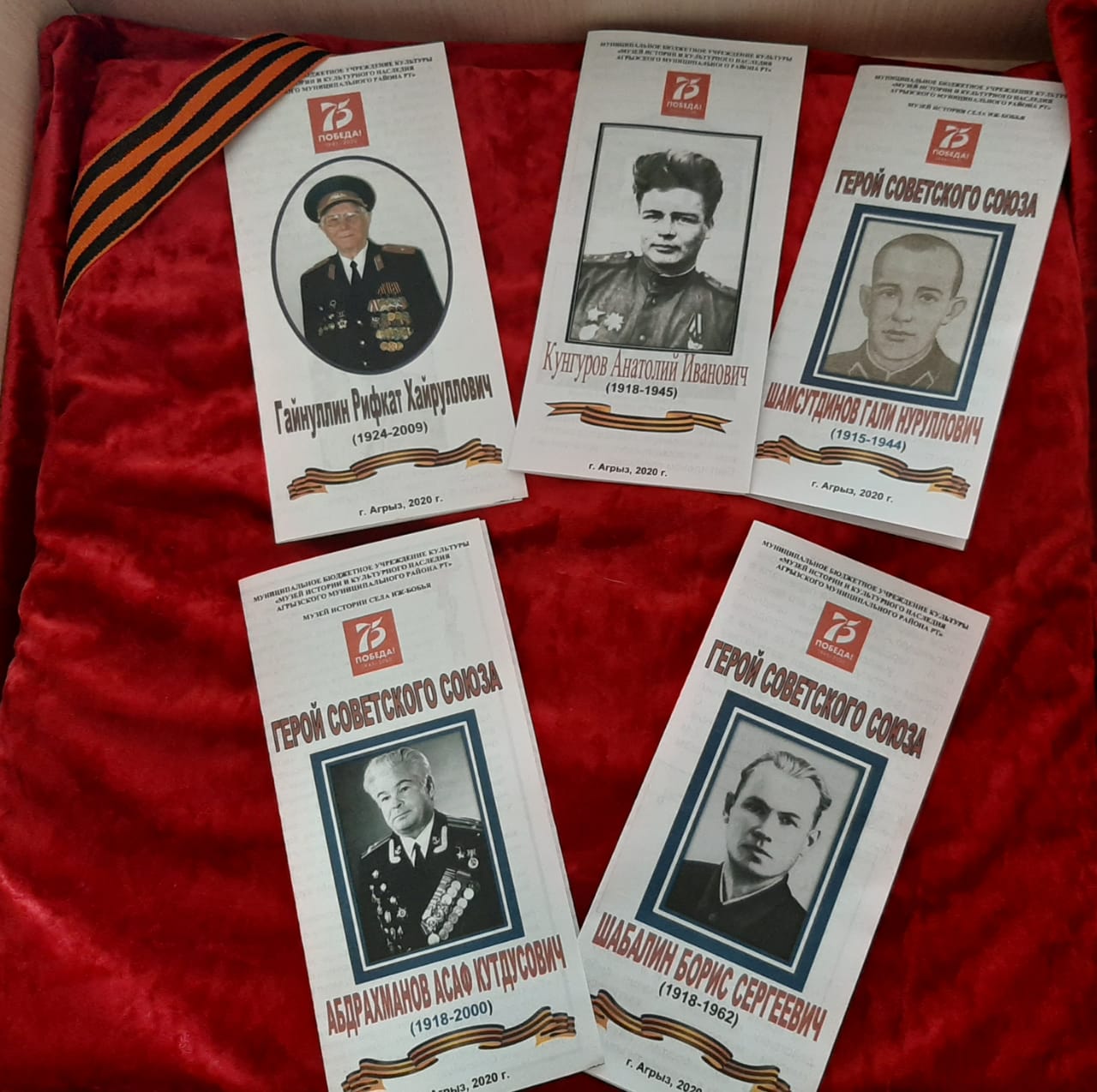 К 75-летию Победы в Великой Отечественной войне 1941-1945 гг. сотрудники Музея истории и культурного наследия Агрызского муниципального района выпустили буклеты, посвященные нашим землякам, героям войны: Абдрахманову Асафу Кутдусовичу, Шабалину Борису Сергеевичу, Шамсутдинову Гали Нурулловичу, Гайнуллину Рифкату Хайруловичу и Кунгурову Анатолию Ивановичу.