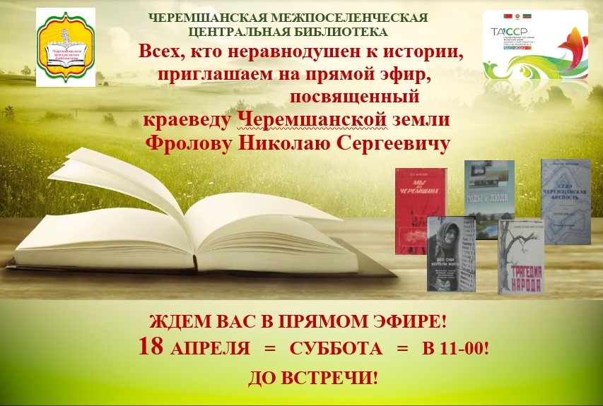 Центральная библиотека села Черемшан на аккаунте в инстаграме рассказала о писателе-краеведе Николае Сергеевиче Фролове. В мае 2020 года свой юбилей отметит писатель-краевед Черемшанской земли Фролов Николай Сергеевич. Он родился 10 мая 1940 года в деревне Ивановка Пестречинского района ТАССР. В 1962 году Николай Сергеевич окончил Казанский сельскохозяйственный институт, а в 1972 году приехал в Черемшанский район. Именно здесь возник у него пристальный интерес к истории.
