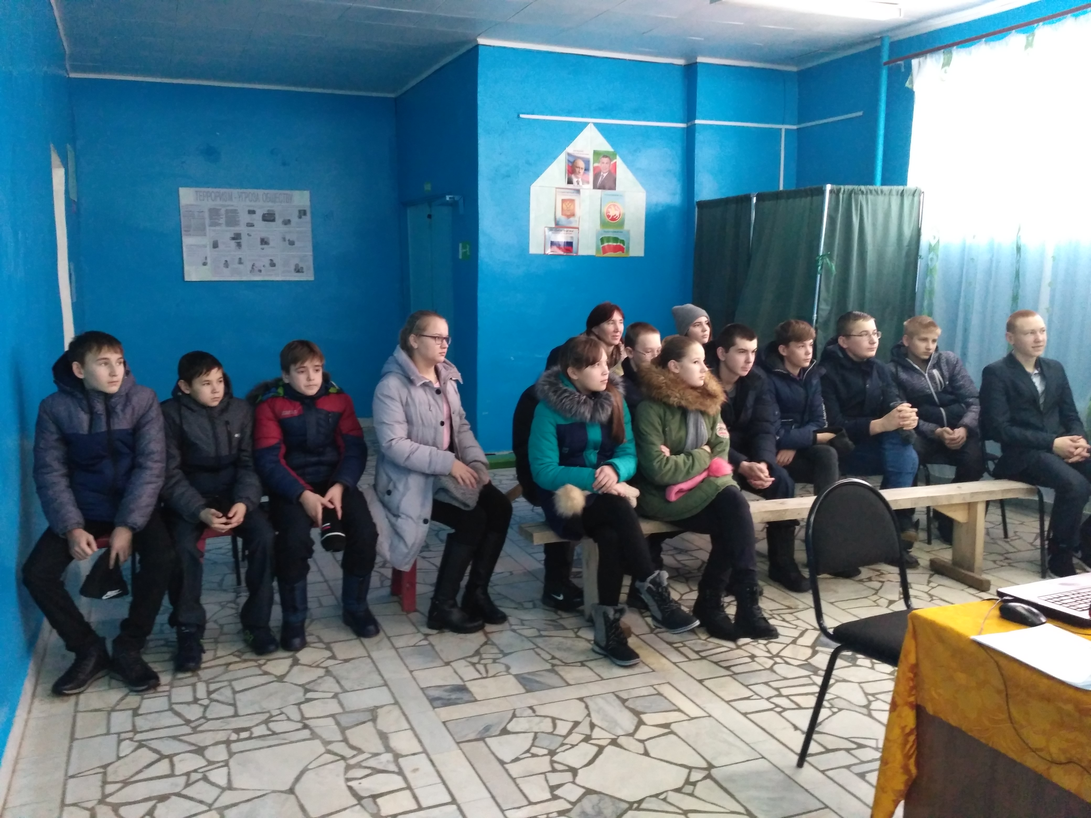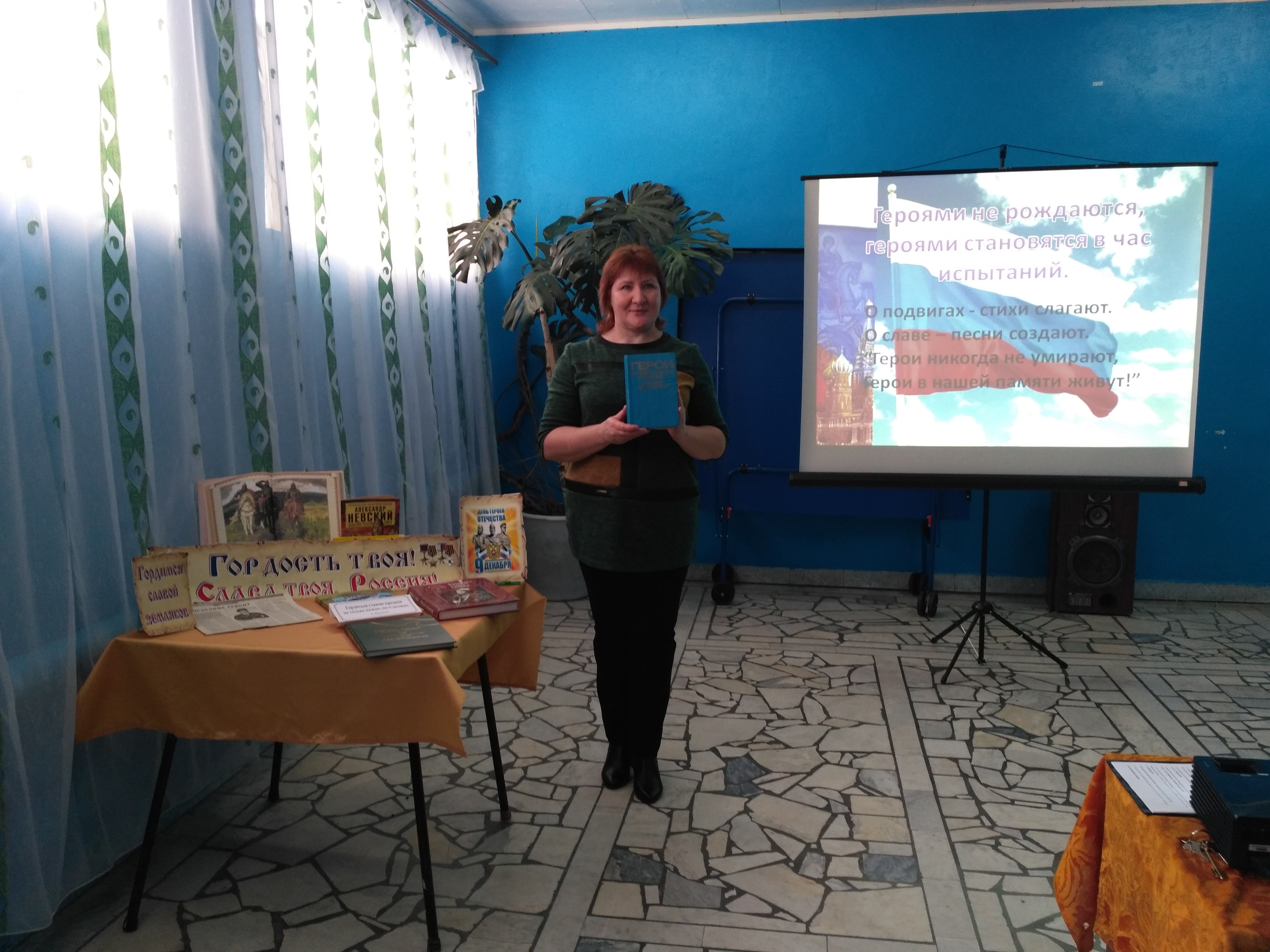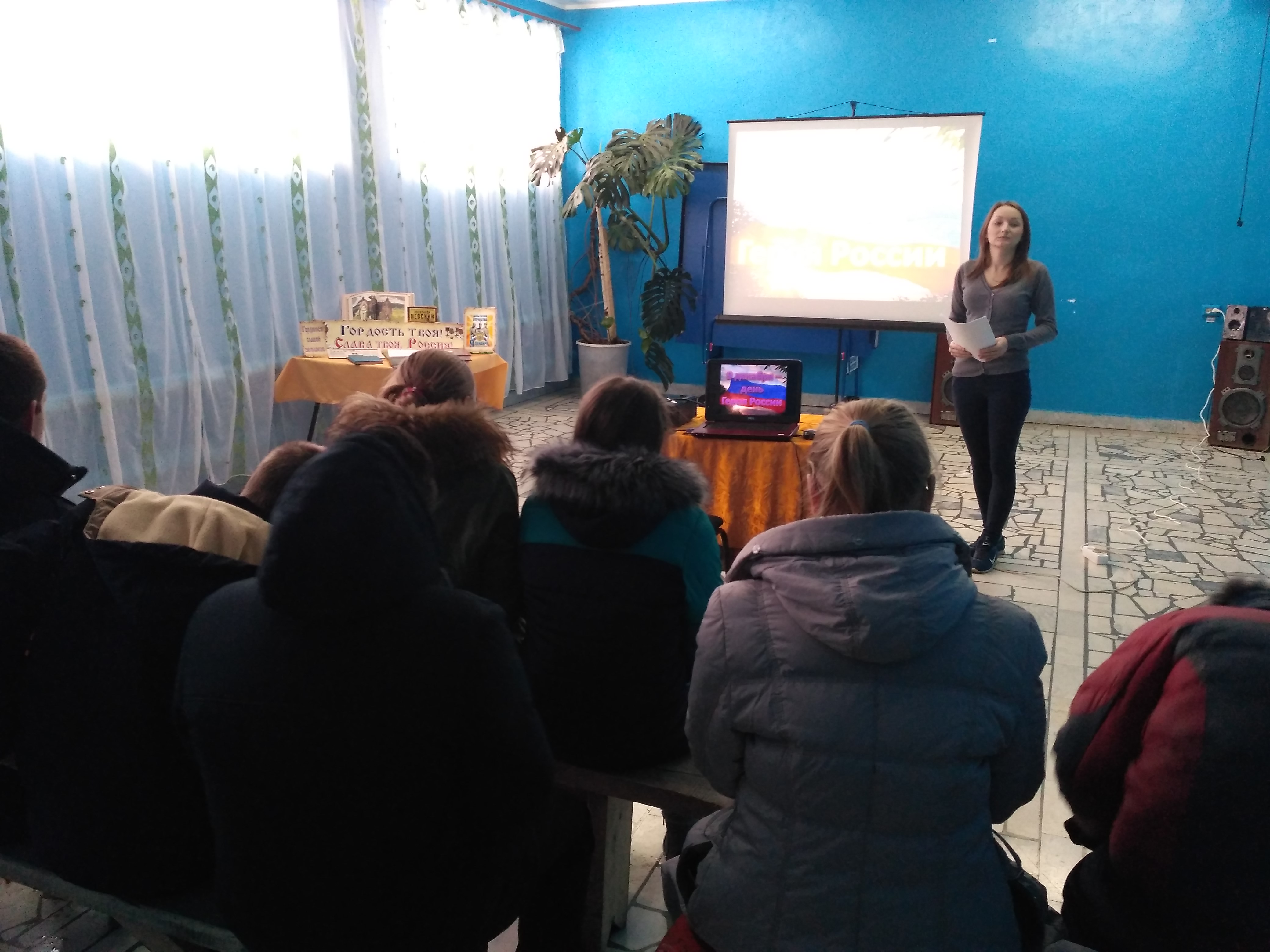 8 декабря, накануне праздника, директор СДК Инна Сопина и библиотекарь Марина Кудашова для ребят среднего и старшего школьного возраста провели час истории «России славные сыны». Школьникам была продемонстрирована слайд - презентация «Герои Отечества», в ходе которого ребята узнали об истории праздника и возникновении высшей награды ордена Святого Георгия Победоносца, медали «Золотая Звезда», Ордена славы.