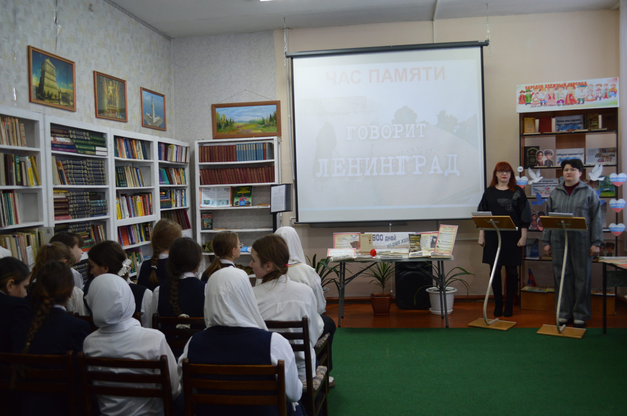 Библиотекари рассказали участникам о тяжелых испытаниях, выпавших на долю жителей осажденного закрытого города Ленинграда: о голоде и холоде, о детях и женщинах, работавших наравне с мужчинами на заводах, о защите и обороне Ленинграда советскими солдатами. Участники просмотрели видеоролики, наглядно показывающие тяжелую жизнь ленинградцев в те нелегкие для всей страны времена. Также вспомнили историю ленинградской школьницы Тани Савичевой, которая во время блокады вела дневник, содержащий девять страшных строк: каждая строка посвящена смерти одного из близких. Прозвучали отрывки из «Ленинградской поэмы», «Февральского дневника» и повести «Дневные звезды» О. Берггольц и другие стихи поэтов-блокадников.