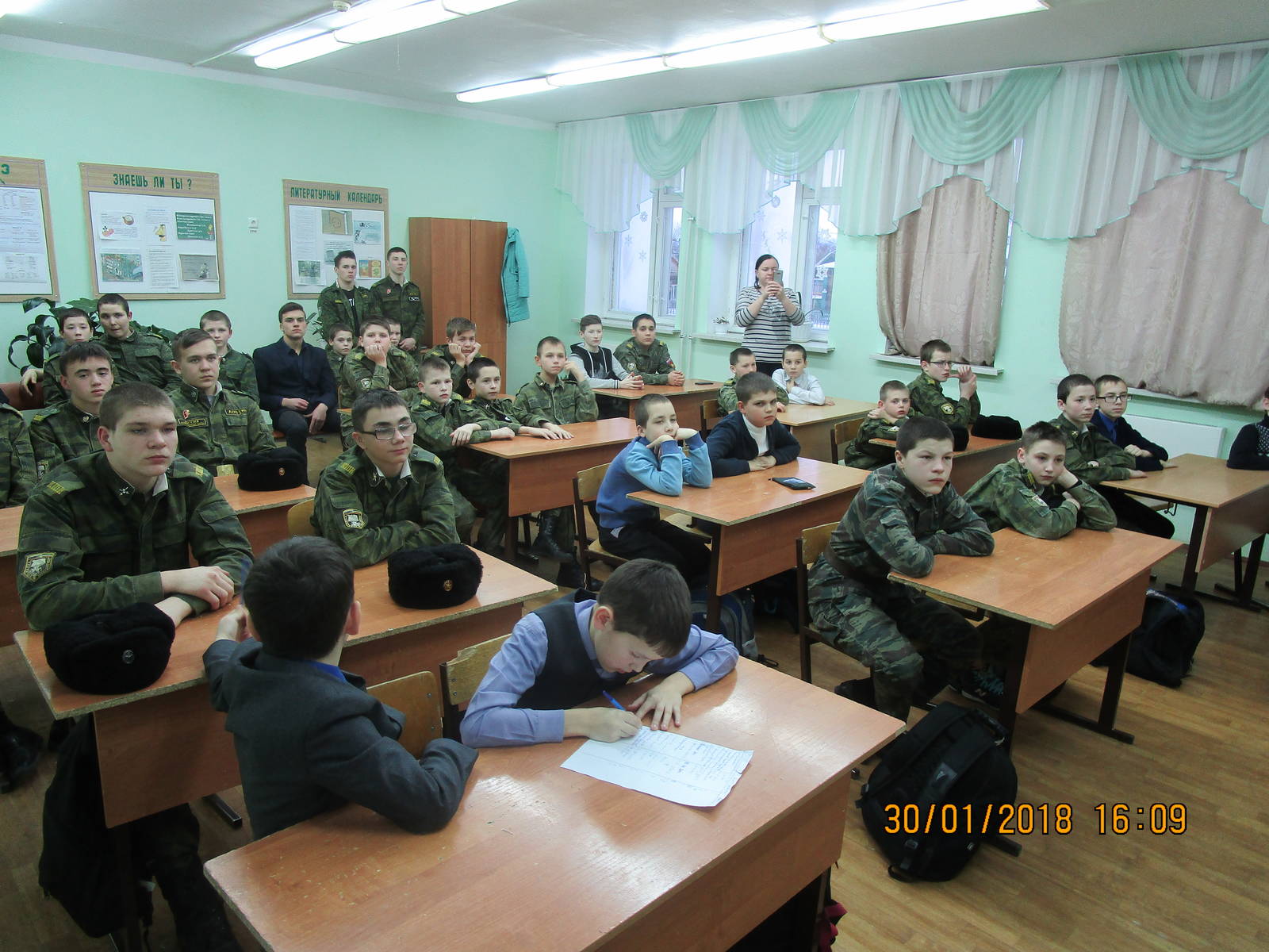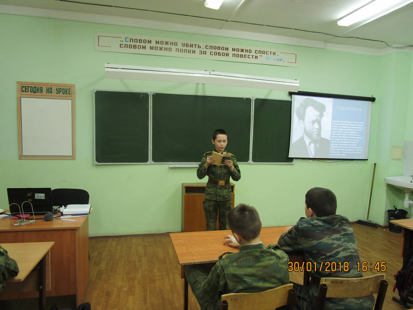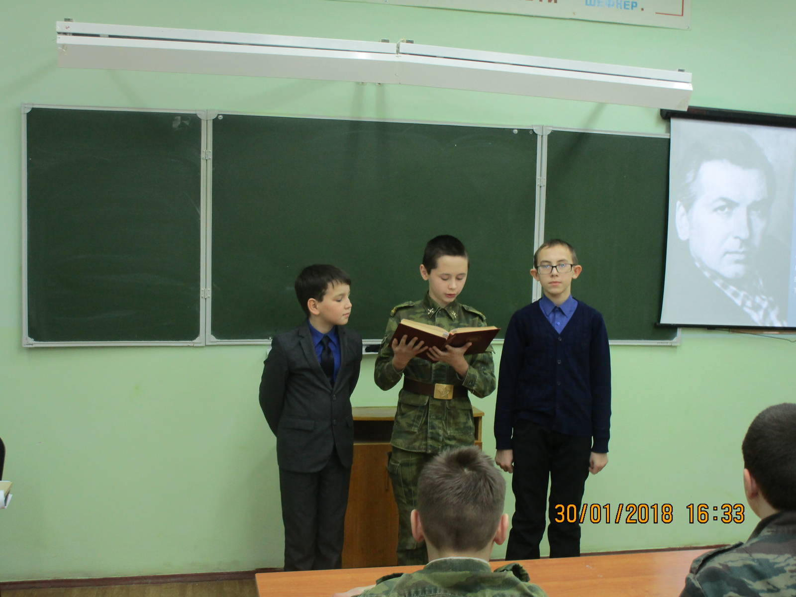 В честь этого дня, который отмечается в нашей стране как День воинской славы России, сотрудник центральной библиотеки 30 января 2018 года провела для учеников кадетской школы-интерната час живого чтения «Это Ленинград! Смотри и слушай! Это Ленинград блокадных дней!». Учащиеся читали стихи как широко известных, так и малоизвестных поэтов, защищавших Ленинград и переживших блокаду: отрывки из «Февральского дневника», «Ленинградской поэмы» Ольги Берггольц, из «Пулковского меридиана» В. Инбер, стихотворения А. Ахматовой, Ю. Воронова, С. Орлова, «Балладу о черством куске» В. Лифшица, слушали документальную запись выступления О.Берггольц по радио. В своих стихах эти поэты очень точно отразили время блокады, показали не только трагизм, боль и лишения ленинградцев, но и чудеса стойкости, мужества и героизма. Библиотекарь рассказала о драматических судьбах поэтов-блокадников, о работе блокадного радио, а презентация наглядно показала ребятам тяжелую жизнь ленинградцев в те нелегкие для всей страны времена. Ребята показали свои знания, отвечая на вопросы викторины «Что мы знаем о блокаде».