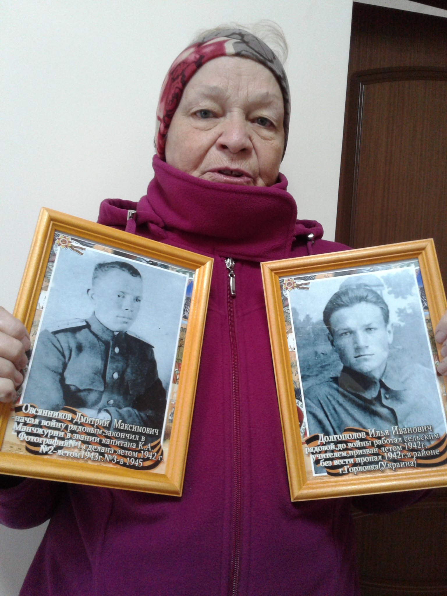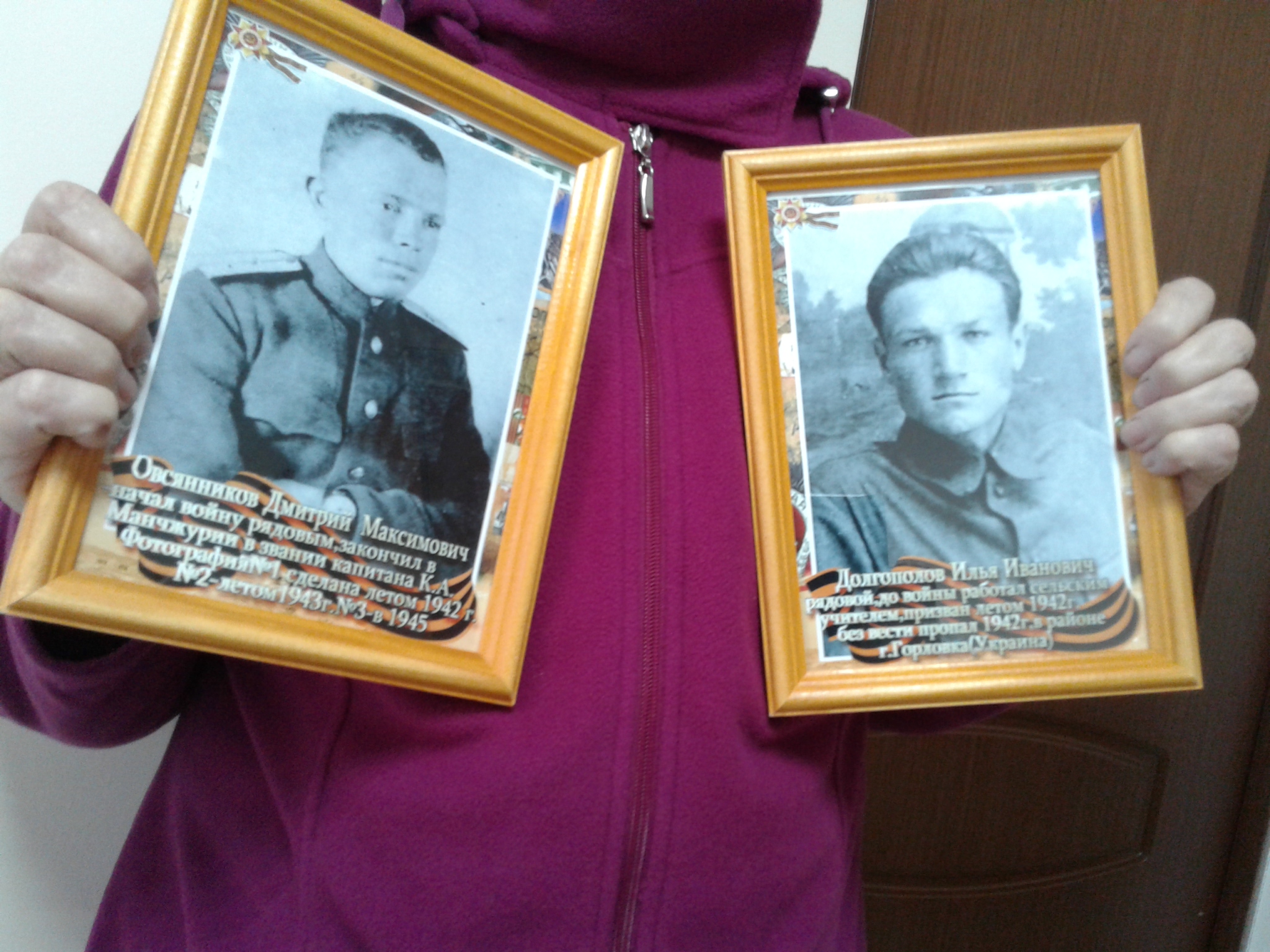 В преддверии 75-ой годовщины Великой Победы советского народа над немецко-фашистскими захватчиками и в рамках музейной акции «Подари музею экспонат», Тихомирова (Овсянникова) Мария Дмитриевна, проживающая в г.Альметьевск, принесла в дар Мемориалу две фотографии из семейного альбома. Ее отец, Овсянников Дмитрий Максимович, был призван в ряды Красной Армии и ушел на фронт в звании рядовой. Закончилась Великая Отечественная война для капитана Овсянникова Д. М. в Манчжурии. Вернулся с Победой в родной дом. Вторая фотография -Долгополов Илья Иванович. Он родной дядя Марии Дмитриевны. До войны работал сельским учителем. Летом 1942 года был призван на фронт и в районе Горловки (на территории Украины) он пал смертью храбрых. С этими фотографиями Мария Дмитриевна каждый год проходит в рядах Бессмертного полка по городским улицам . Теперь они пополнили «ряды» постоянной музейной экспозиции «Солдаты Отчизны». Мы, сотрудники Мемориального центра, благодарим всех наших земляков-дарителей, которые чтят память о своих родственниках-фронтовиках, и надеемся на дальнейшее сотрудничество!