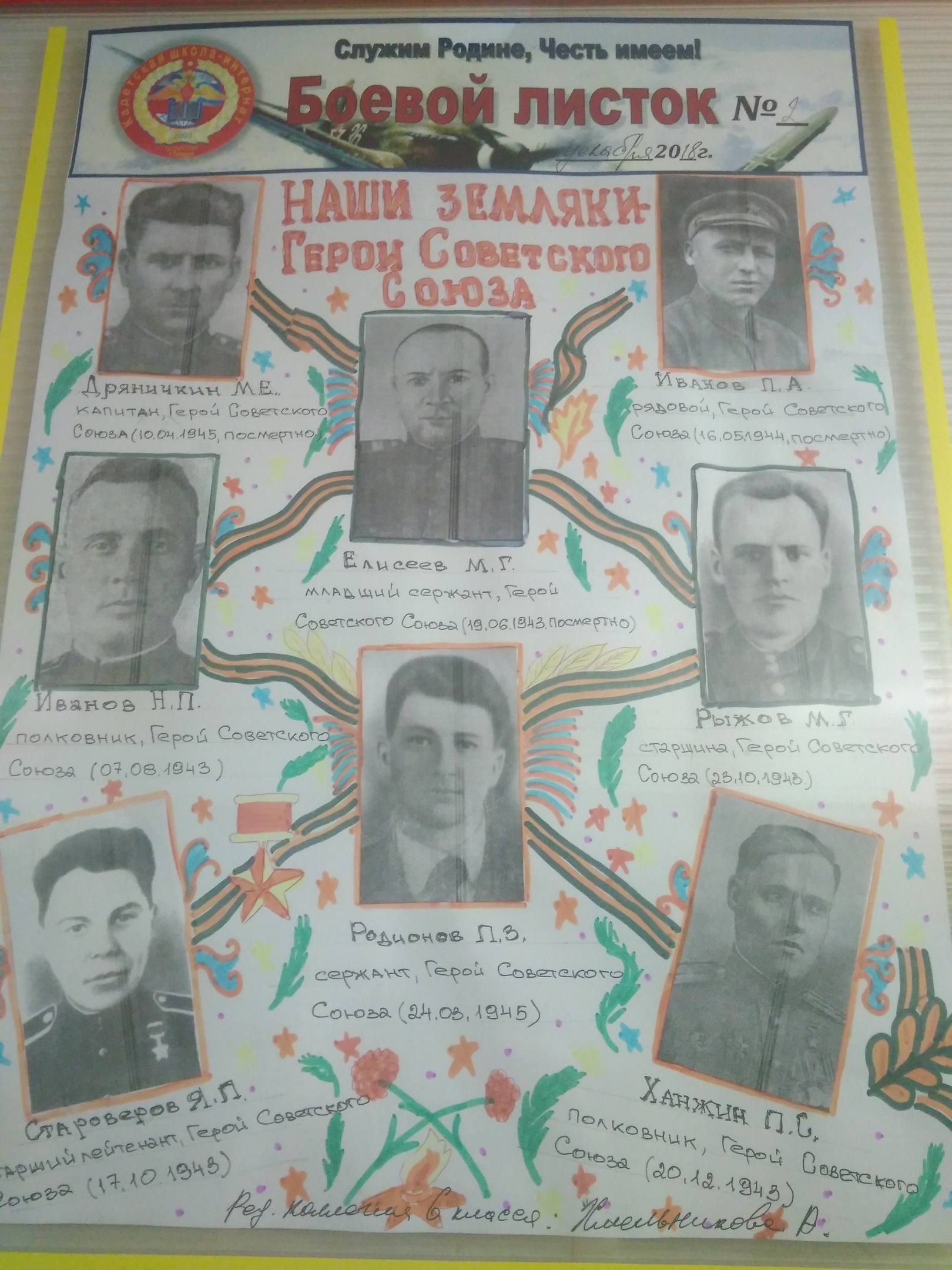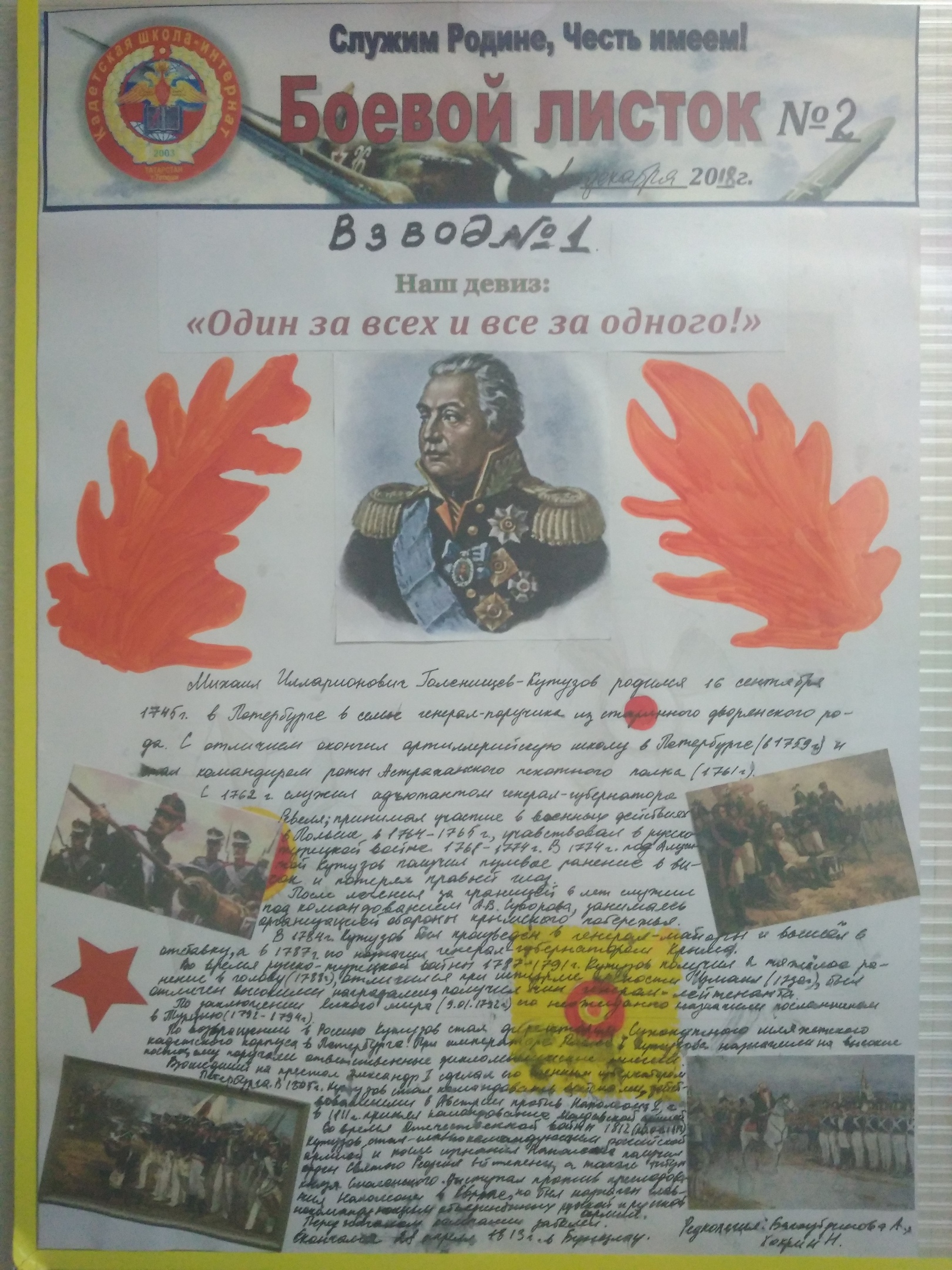 Воспитанниками Тетюшской кадетской школы-интерната выпущены боевые листки, посвященные Дню Героев Отечества и Дню Неизвестного Солдата Члены корреспонденты рассказали о Героях – наших земляках, а также о М. И. Кутузове и Г.К. Жукове.