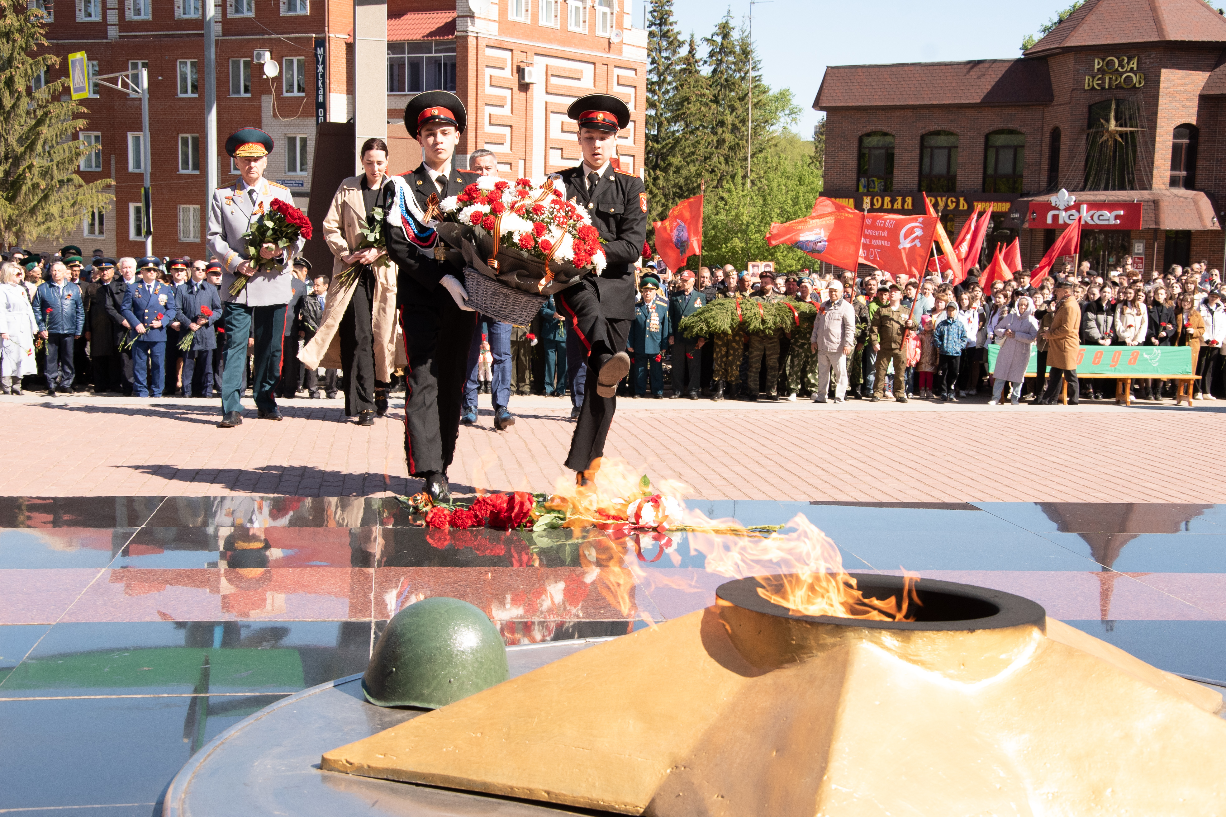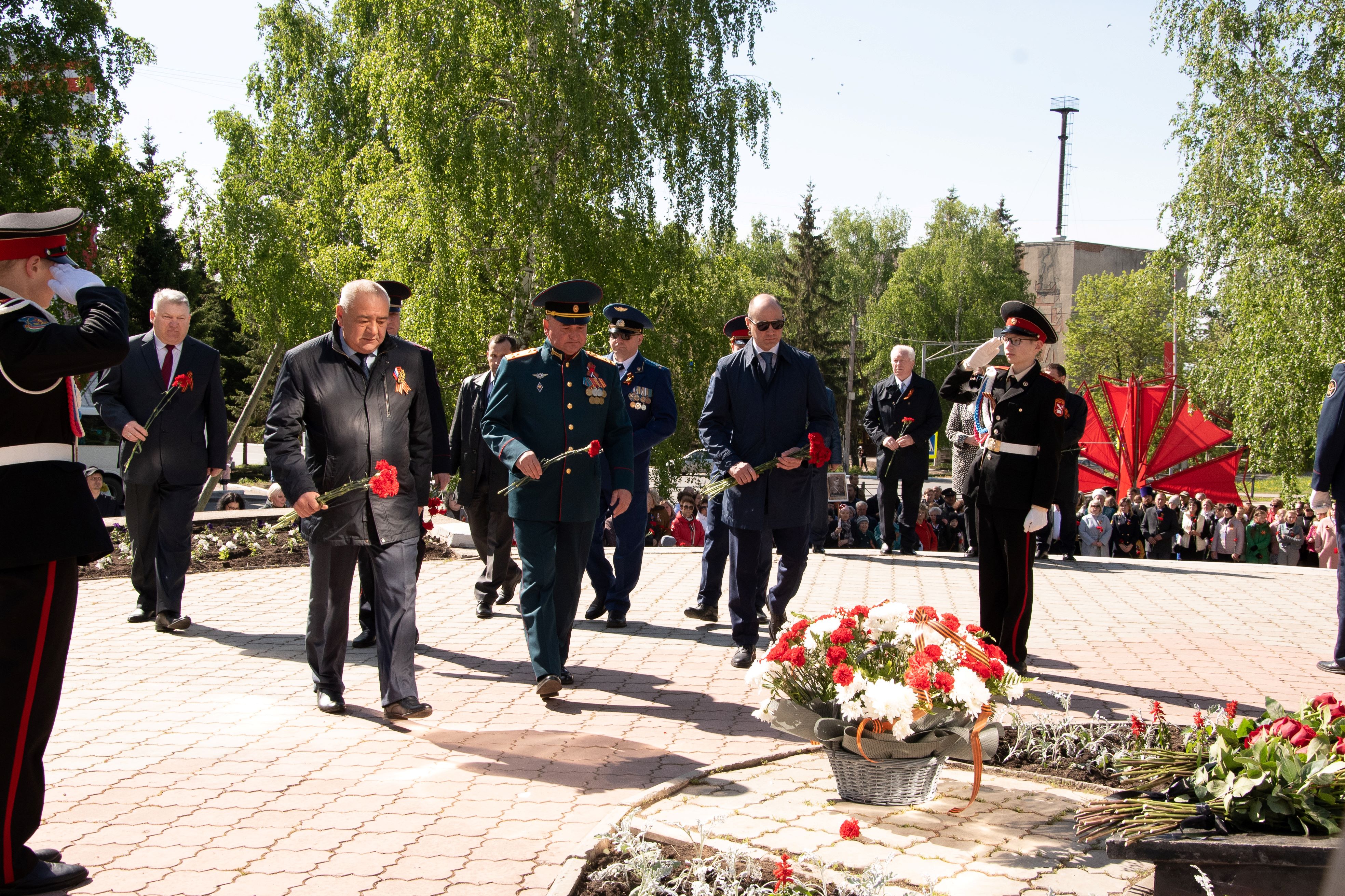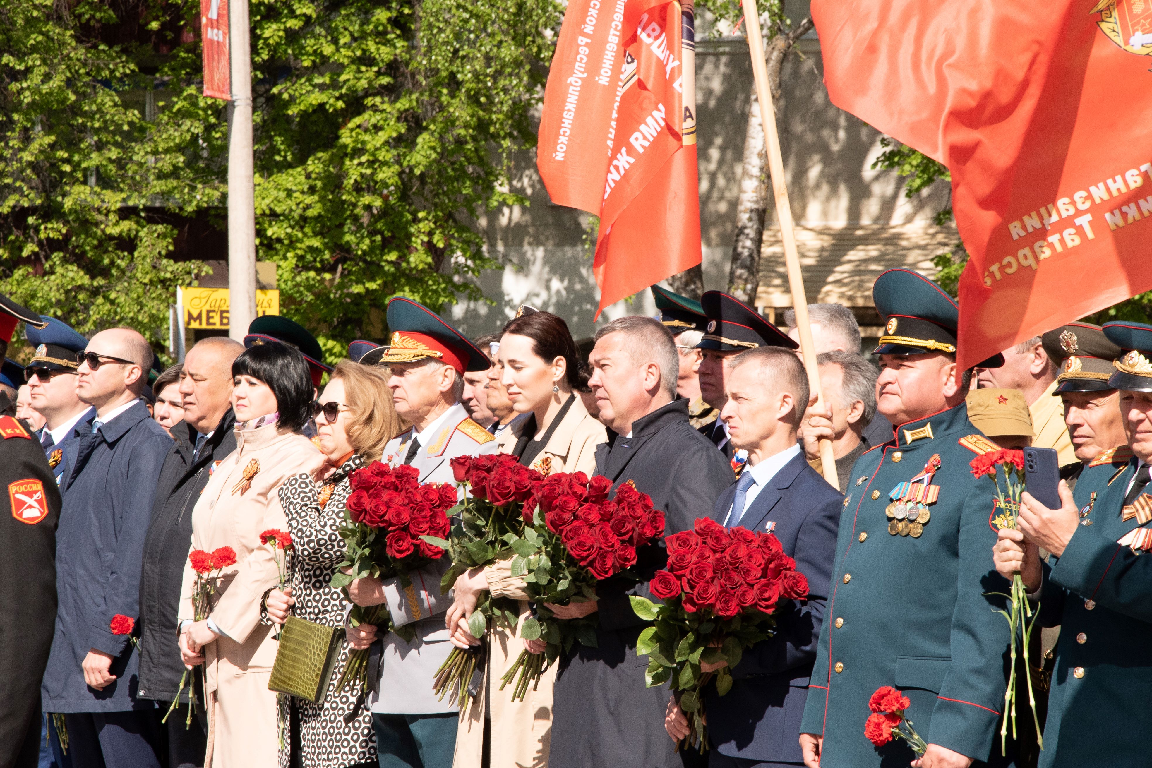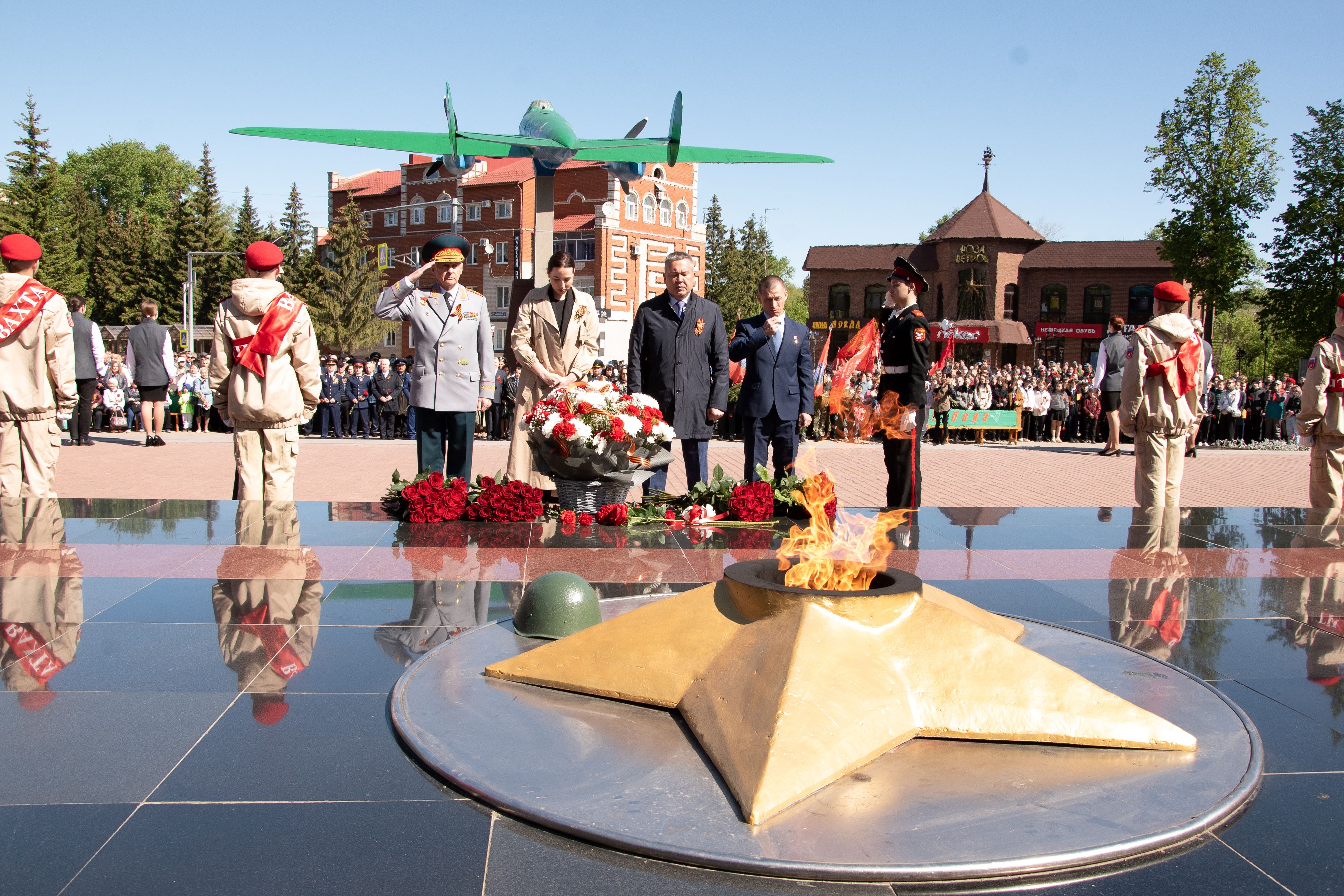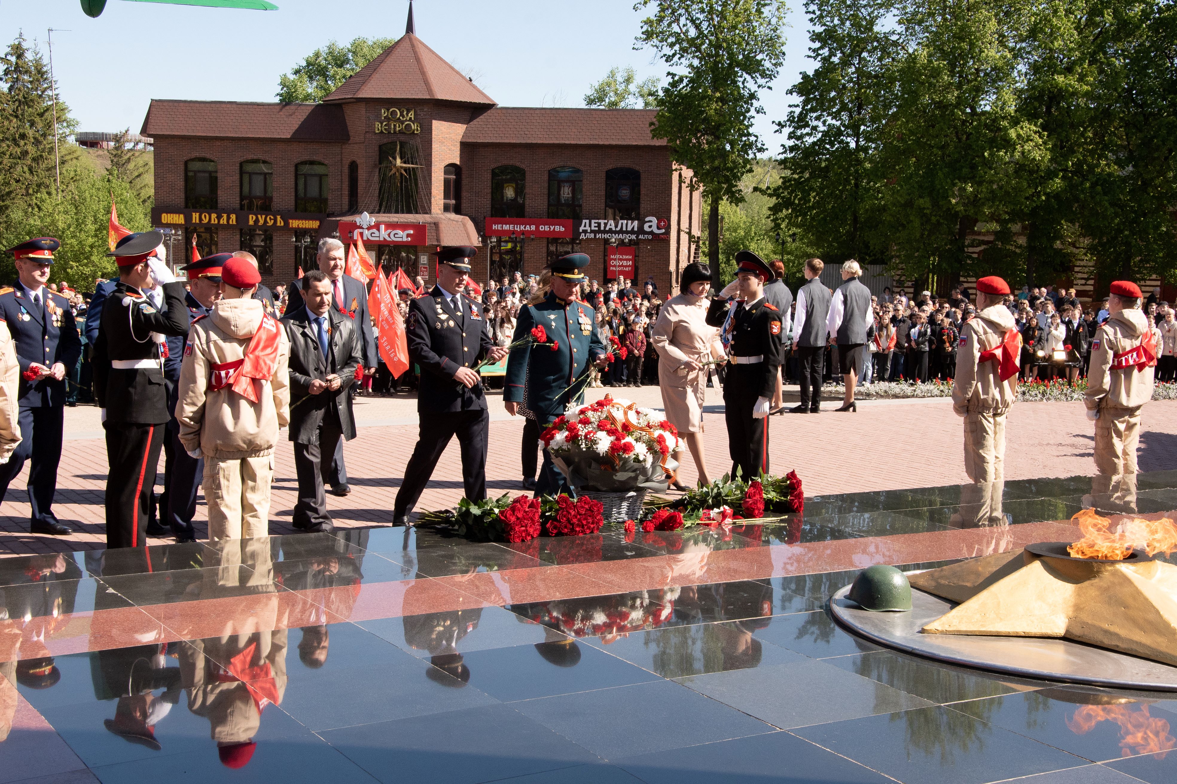 Церемонии возложения цветов прошли в парке культуры и отдыха на улице Красноармейской у мемориала памяти, у стелы 352-й стрелковой дивизии, у мемориала Вечной славы и на аллее Героев.