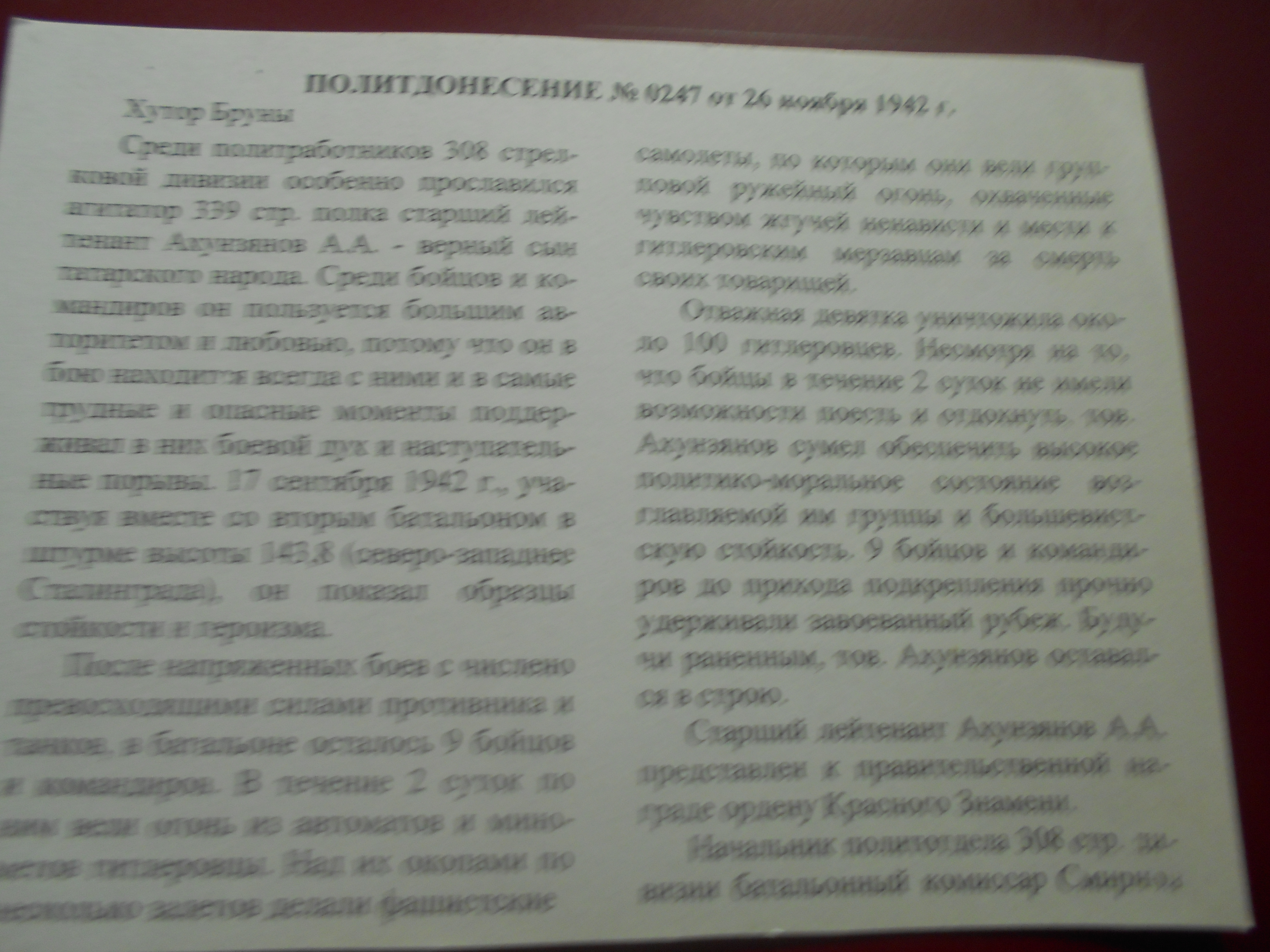«Среди политработников 308 стрелковой дивизии особенно прославился агитатор 339 стр. полка старший лейтенант Ахунзянов А.А. верный сын татарского района…» Что написано дальше вы можете узнать приходя в наш музей.
