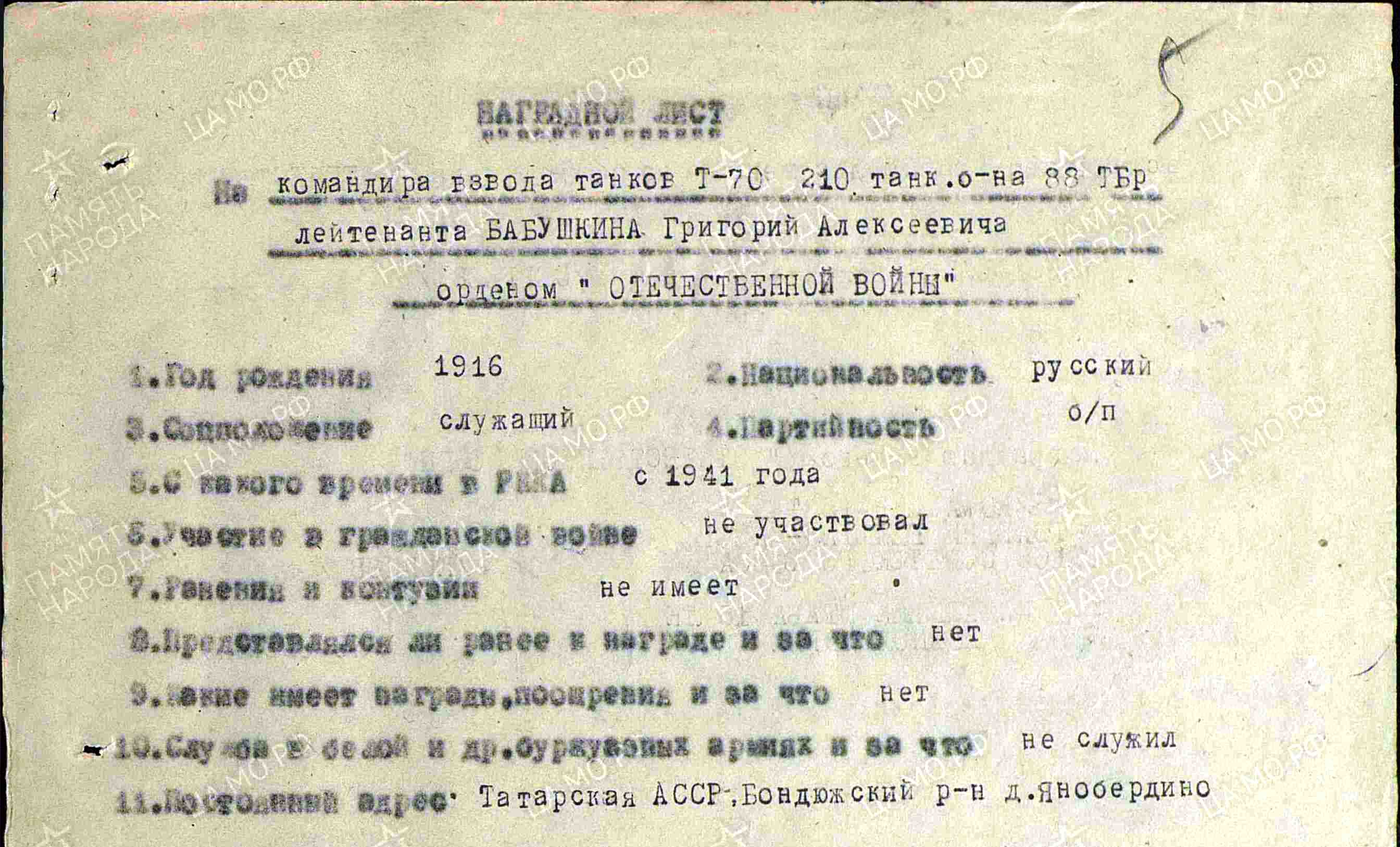 Среди них лейтенант, командир взвода танков Т-70 Бабушкин Григорий Алексеевич 1916 года рождения, д.Енабердино, посмертно награжденный орденом Отечественной войны второй степени.