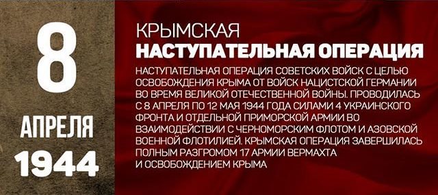Крымская операция наступательная операция советских войск с целью освобождения Крыма от войск нацистской Германии во время Великой Отечественной войны проводилась с 8 апреля по 12 мая 1944 года.