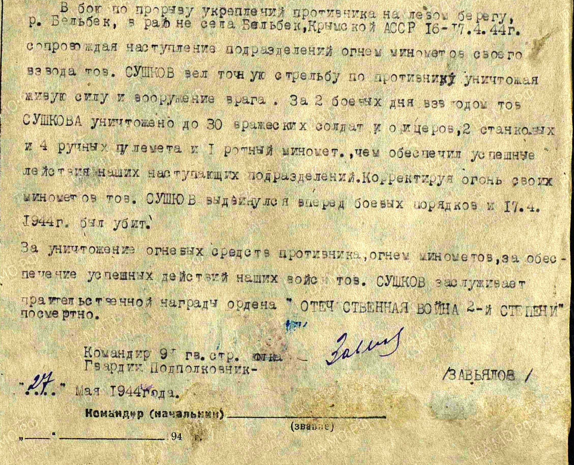 Согласно документам Министерства обороны, уроженец села Старое Гришкино Сушков Михаил Иванович, гвардии лейтенант, погиб в бою 17.4.1944 г. по прорыву укрепления противника на левом берегу р.Бальбек, Крым.