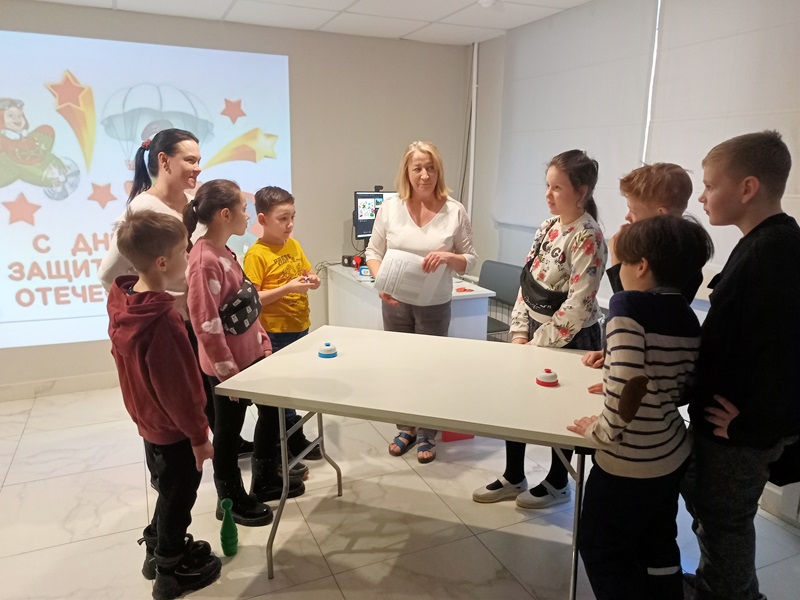 Следующей частью мероприятия стала игровая программа «Аты-баты, шли солдаты». Ребята узнали о различных видах войск, входящих в состав Российских Вооруженных сил. В подвижных конкурсах «Собери волю в кулак», «Меткий стрелок», «Минное поле», «Санчасть» дети смогли проявить свою ловкость и командный дух. Не обошлось и без интеллектуальных заданий! Вопросы викторины «Знатоки» и «Разведчики» проверяли знания детей о военной истории и традициях.