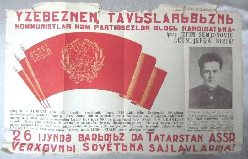 По всей стране сегодня стартовали выборы, потому и изображение будет соответствующее – агитационная листовка на татарском языке кандидата в депутаты Верховного Совета ТАССР Ефима Семеновича Леонтьева. В июне 1938 года Верховный Совет в составе 143 депутатов был избран впервые и проработал до 1947 года (из-за войны его полномочия были продлены). Ефим Леонтьев выдвигался от коллектива Чистопольского судоремонтного завода.