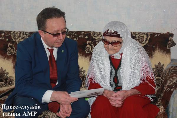 27 февраля, свой 90-летний юбилей отметила жительница села Аккузово Гарипова Гиная Гариповна. Долгожительницу с юбилеем поздравил руководитель Аппарата Совета муниципального района Айдар Хаев. Он вручил ей персональное поздравление Президента РФ Владимира Путина, памятный подарок от главы района и поблагодарил юбиляршу за самоотверженный труд и пожелал крепкого здоровья.