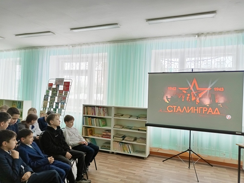 Ведущая познакомила юных читателей с хроникой тех событий, рассказала про стойкость и героизм советских солдат, сражавшихся на протяжении 200 дней и ночей, ставших началом Великой Победы советского народа. С большим интересом ребята смотрели архивные кадры видеохроники «Сталинградская битва», «Битвы и сражения». Узнали о героическом доме Павлова, подвиге Михаила Паникаха, Матвея Путилова и подвиге «Тридцати трех». Собравшимся ребятам был проведен обзор книг о Сталинградской битве и зачитаны произведения из антологии «Венок славы».