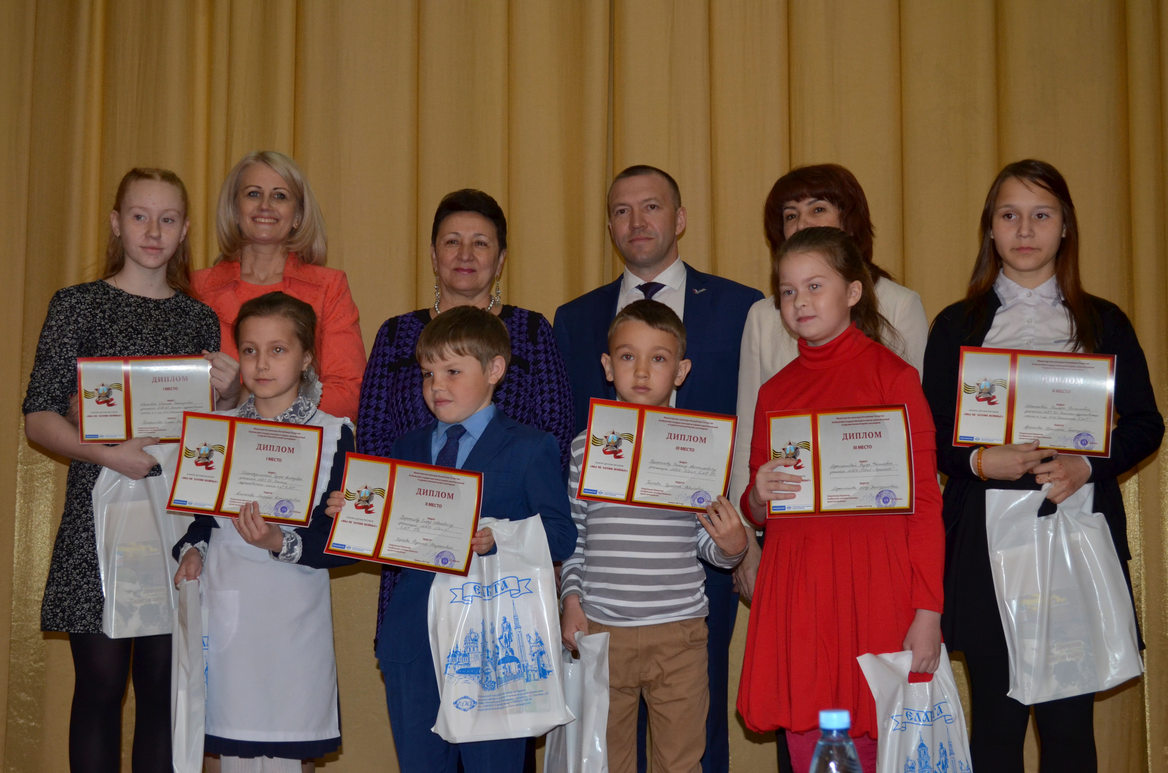 Далее на сцену поднялись победители и призёры организованного Елабужским государственным музеем-заповедником конкурса детского рисунка «Мы не хотим войны!». Из 105 рисунков жюри отобрало 9 лучших: по три в каждой из возрастных категорий.
