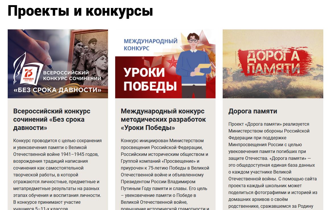 Всю информацию о проектах и конкурсах, которые проводит и поддерживает Министерство просвещения, в специальном разделе «Год памяти и славы» по ссылке