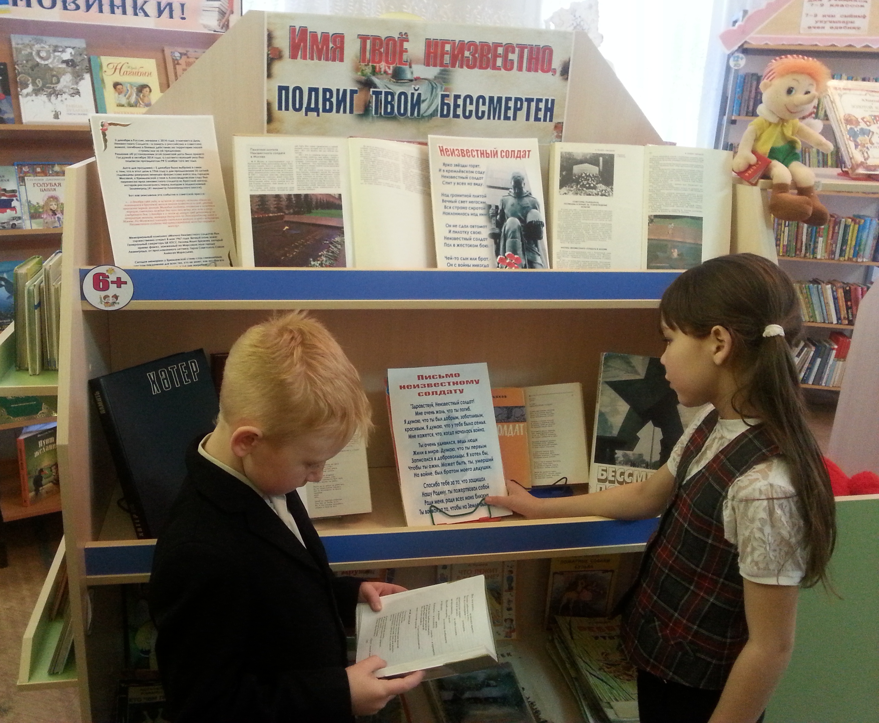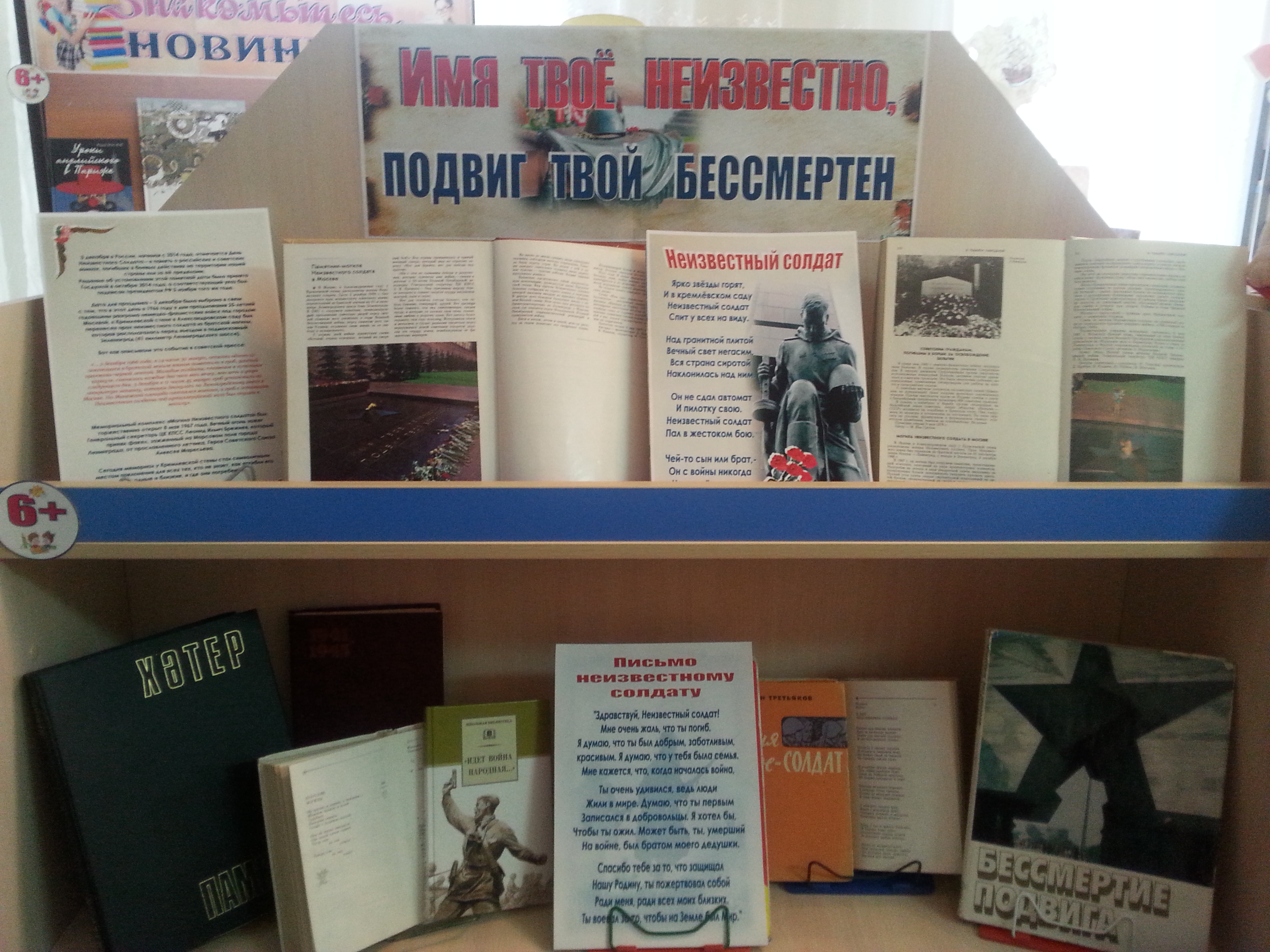 В октябре 2014 года Указом Президента РФ была установлена еще одна памятная дата - 3 декабря — День Неизвестного Солдата. К этому дню в Детской библиотеке оформлена информационно-иллюстративная выставка «Имя твое неизвестно — подвиг твой бессмертен». Из обзоров, проводимых по выставке, юные читатели узнают об истории возникновения этой даты, о бессмертном подвиге советских людей и о тех, кто не вернулся с войны, о значительных памятниках и мемориальных ансамблях, находящихся на территории России.