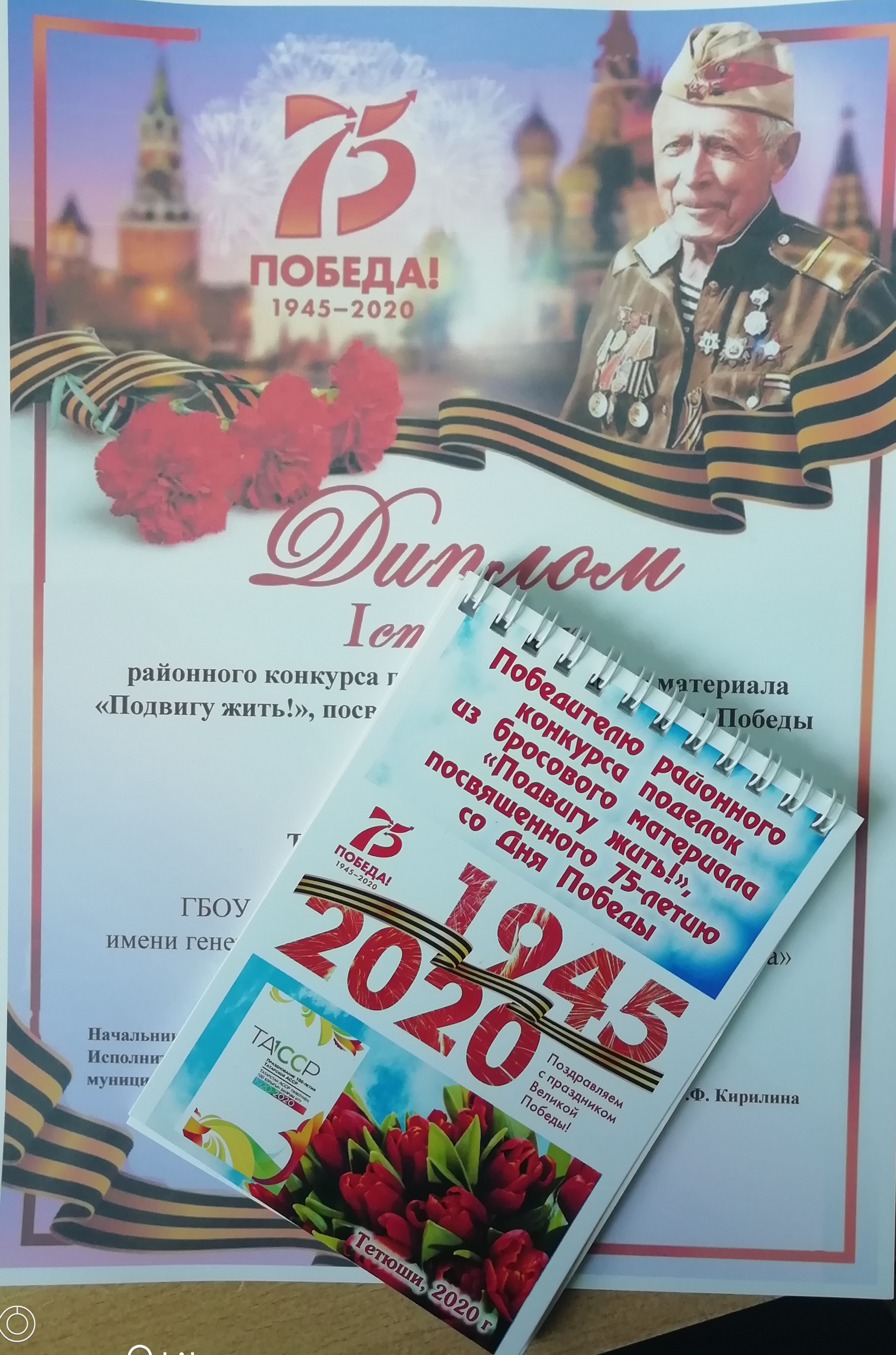 С целью выявления и поддержки одарённых детей, их духовного развития, повышения интереса детей разного возраста к истории Великой Отечественной войны, МКУ «Отдел образования ИК ТМР РТ» проведен районный конкурс поделок из бросового материала «Подвигу жить!», посвященный 75-летию со Дня Победы.