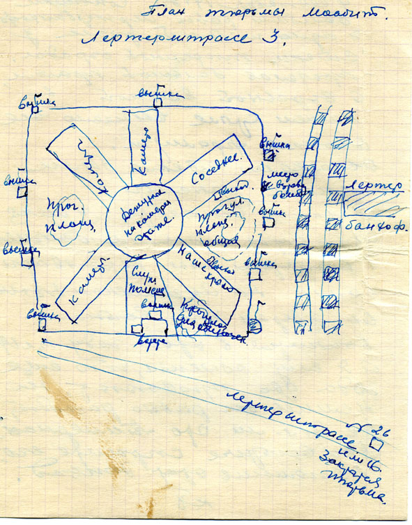 Я набросал схемку тюрьмы на Лертерштрассе, 3 как она запомнилась мне. В прогулочном дворике я ежедневно из окна камеры наблюдал за узниками, не подходя к окну, чтобы не привлечь внимания охраны и не угодить в бункер. Прогуливались здесь и Джалиль с однокамерниками, но до встречи в бане я не знал его в лицо. Мне запомнилось, что он вел себя энергичнее всех на прогулке и первым начинал физкультурные упражнения…»