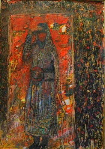 Другая, также вертикальная по размеру, картина «Ожидание» решена лаконичным изобразительным языком. Одинокая женская фигура в центре композиции окружена красным сиянием. Вероятно, хозяйка стоит на пороге своего дома, или у ворот – символической пограничной зоны, портала, который соединяет мир прошлого с настоящим, нынешним. За спиной у вдовы – тепло домашнего очага, горячие краски бытия. Она смотрит вдаль, полная надежды на встречу.
