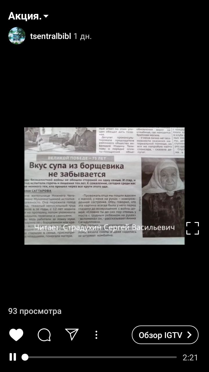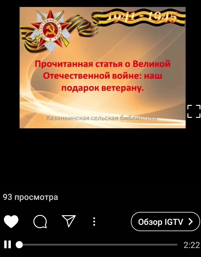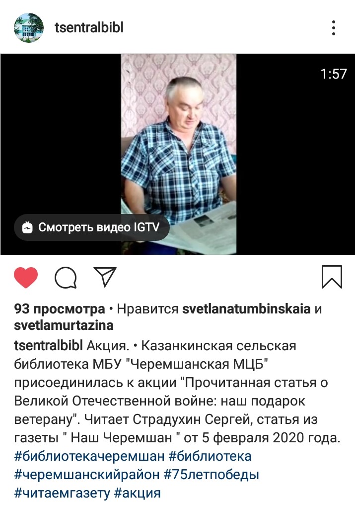 В рамках 75-летия Великой Отечественной войны Казанкинская библиотека Черемшанского района участвует в Акции «Прочитанная статья о Великой Отечественной войне: наш подарок ветерану»,организованной Центральной библиотекой МБУ "Черемшанская МЦБ" села Черемшан. В рамках этой акции жители села Казанка приняли участие в чтение статей из газеты «Наш Черемшан». Заходите на наш аккаунт в Инстаграме и ознакомьтесь с участниками акции.