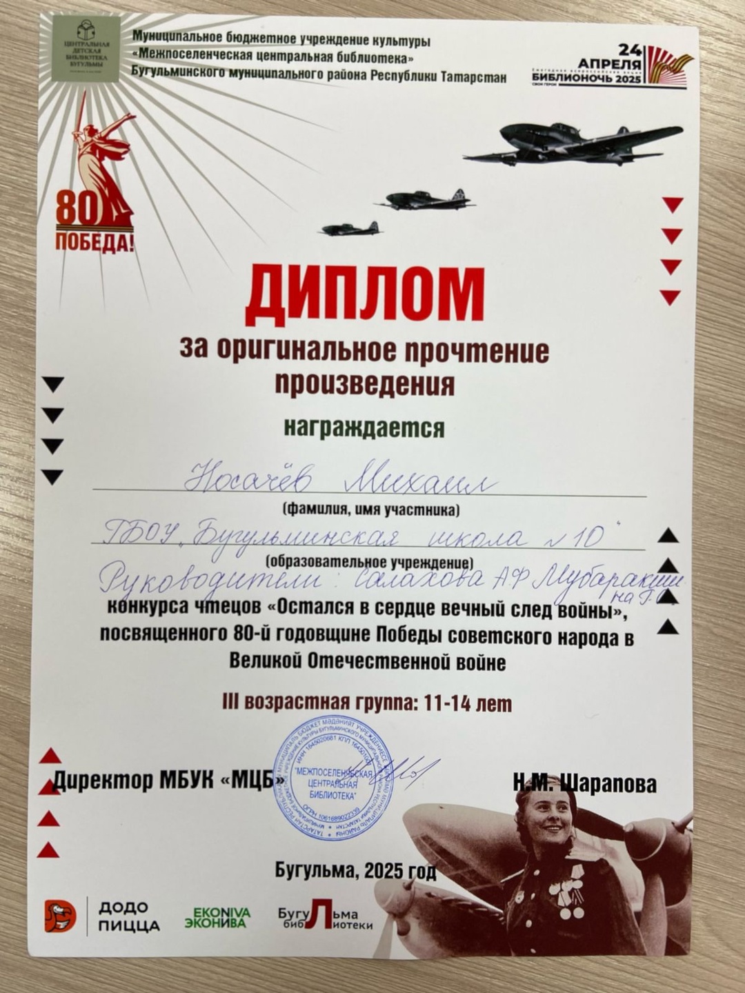 24 апреля в центральной детской библиотеке прошёл очный этап конкурса чтецов «Остался в сердце вечный след войны» в рамках Всероссийской акции «Библиосумерки». Ученик 10 школы Носачев Михаил получил диплом в номинации за оригинальное прочтение произведения. Его прочтение тронуло сердца зрителей и жюри, заслуженно принеся ему победу в номинации. Поздравляем Михаила и его наставников – классного руководителя Салахову А.Ф. и воспитателя Мубаракшину Г.С. за подготовку и поддержку Михаила, за воспитание чувства патриотизма и уважения к истории своей страны. Желаем Михаилу ещё много ярких побед и достижений!