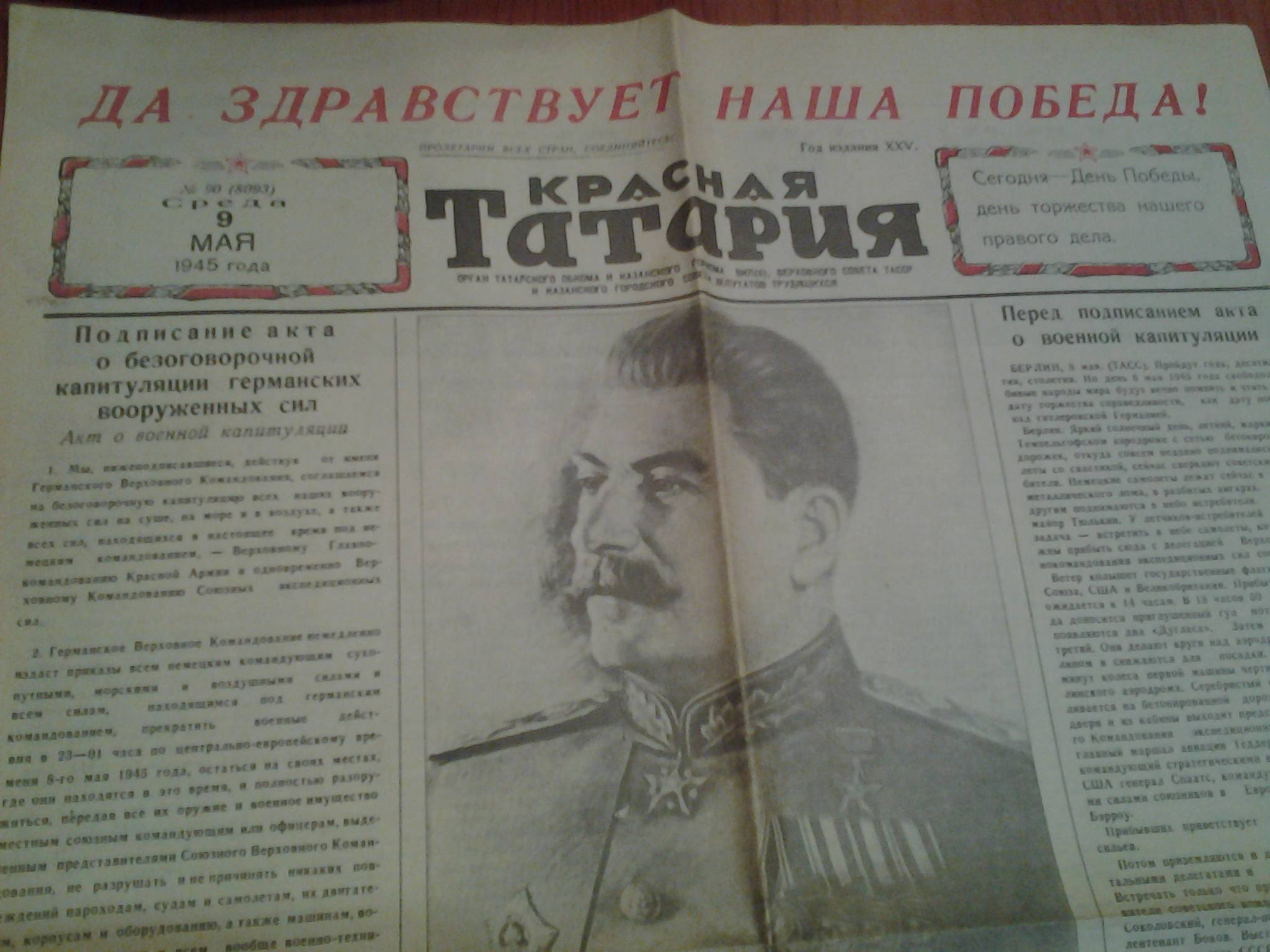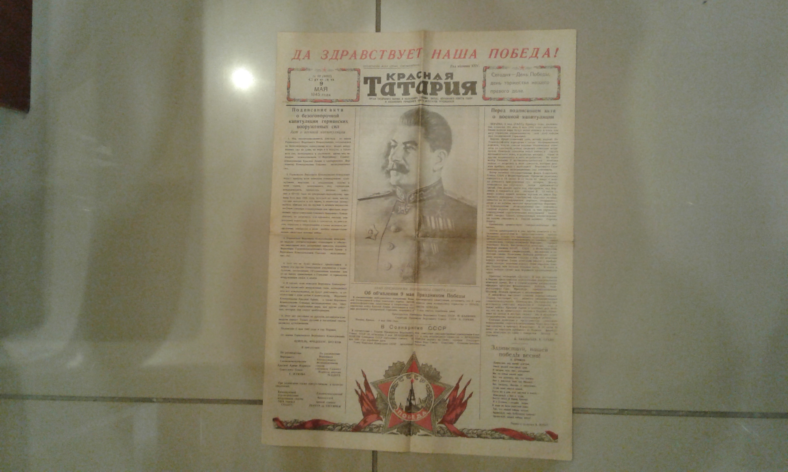 Фонды Черемшанского МБУ "Мемориальный центр" пополнились новым интересным экспонатом. Сторожил села Черемшан Уздяева Мария Алексеевна принесла газету "Красная Татария", которая датирована победным 9 маем 1945 года, в дар музею.Этот экспонат является одним из ценнейших в истории XX века. На страницах республиканской газеты "Красная Татария" было напечатано долгожданное известие для советского народа - о Великой Победе. "Сегодня День Победы - день торжества нашего правого дела", так написано в предисловии к подписанию Акта о безоговорочной капитуляции германских вооруженных сил. Данное периодическое издание - это живое свидетельство славной даты Дня Победы Советского Союза над немецким фашизмом.