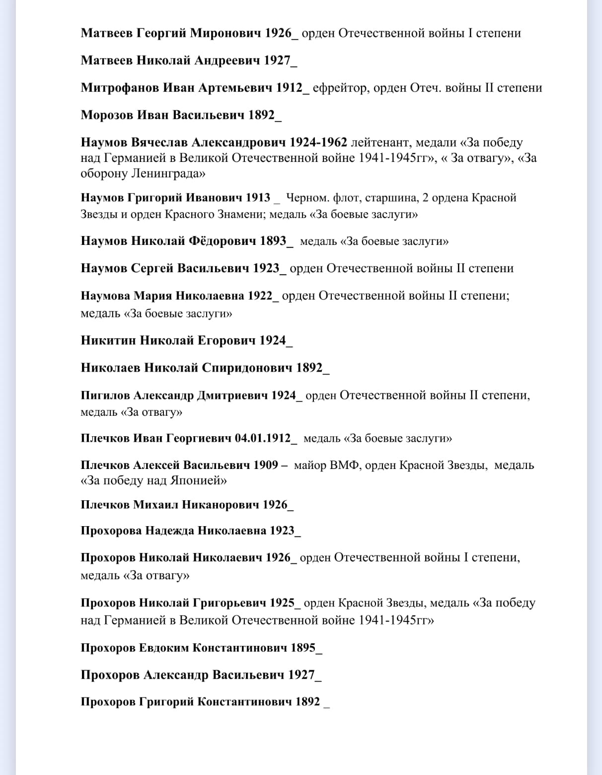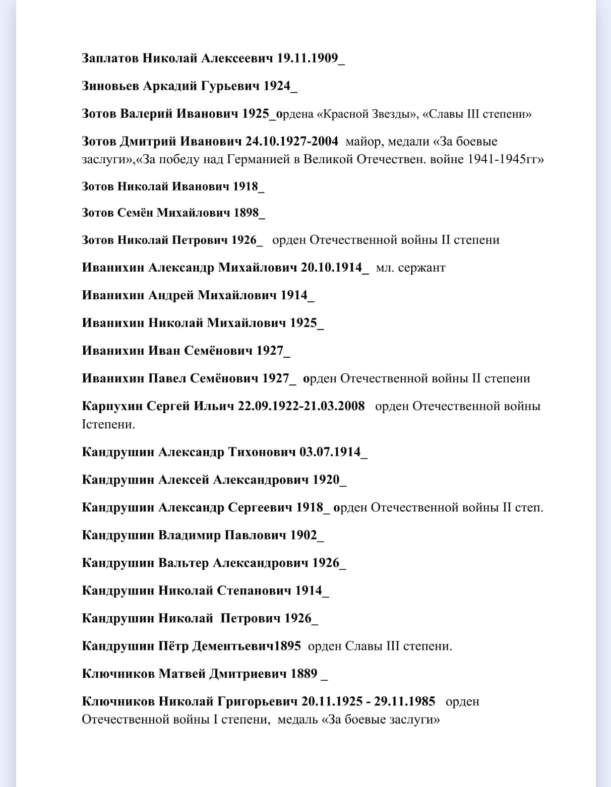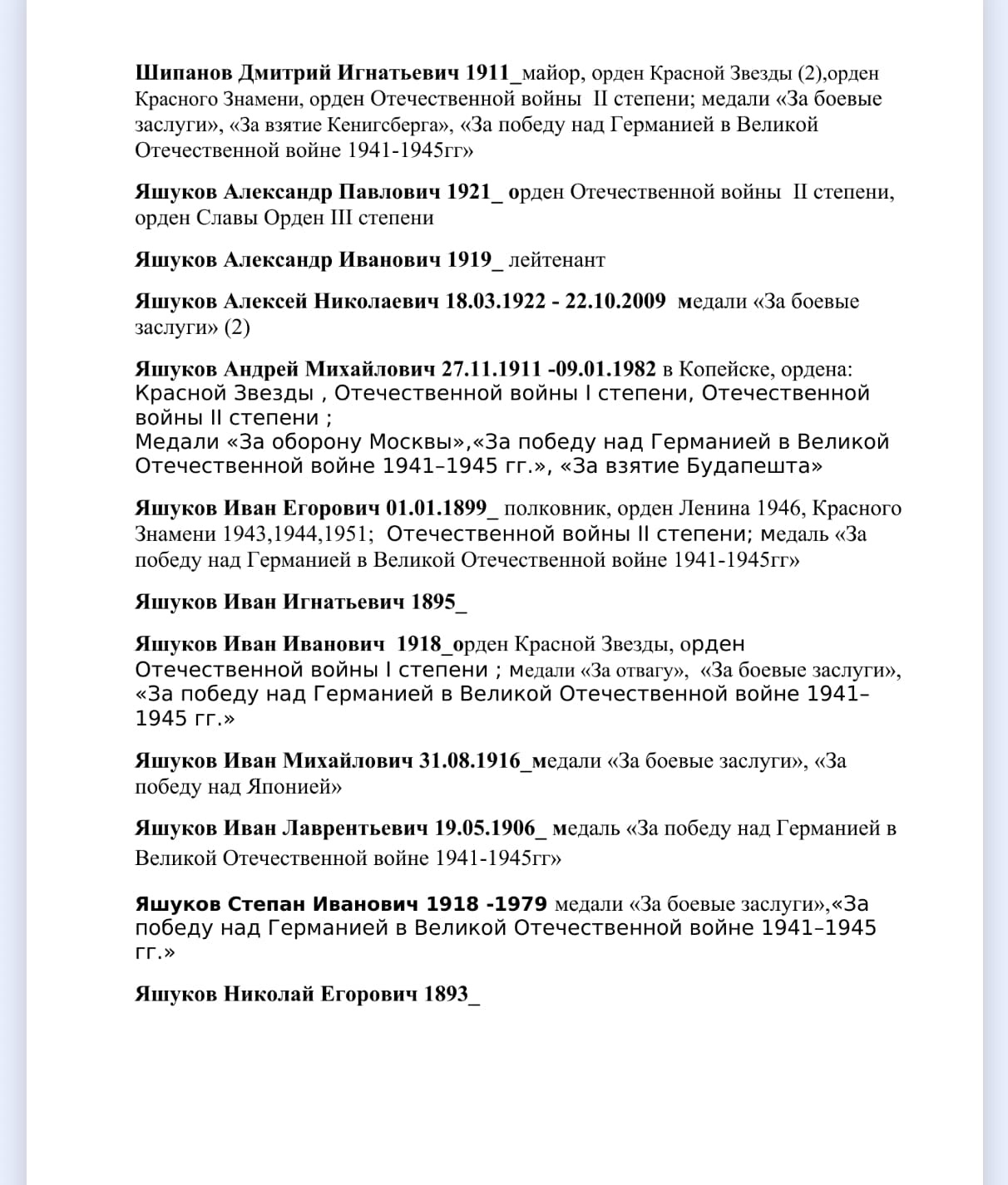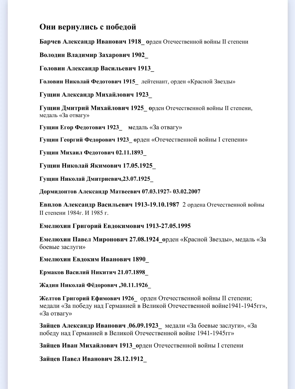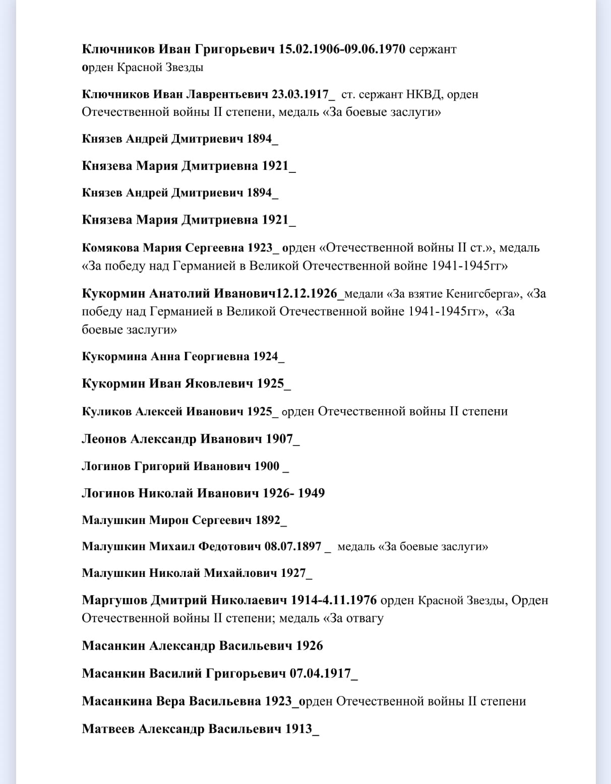 Ранее в своих публикациях я не раз писала о воевавших сельчанах: сыне председателя колхоза Яшукове Александре Павловиче, своем дяде Наумове Вячеславе Александровиче; погибших на войне Алексее, Георгие и вернувшихся Николае и Дмитрие - из многодетной семьи Ивана и Ксении Зотовых, о братьях Ключниковых Иване, Александре Сергее и Николае Григорьевичах. Упоминала в текстах орденоносцев Евплова Александра Васильевича, Яшукова Андрея Михайловича, Плечкова Алексея Васильевича, погибшего в 1941г. Кувшинова Степана Ивановича, прожившего после войны в Тетюшах ветерана Яшукова Алексея Николаевича и др. Хочется оставить память обо всех.