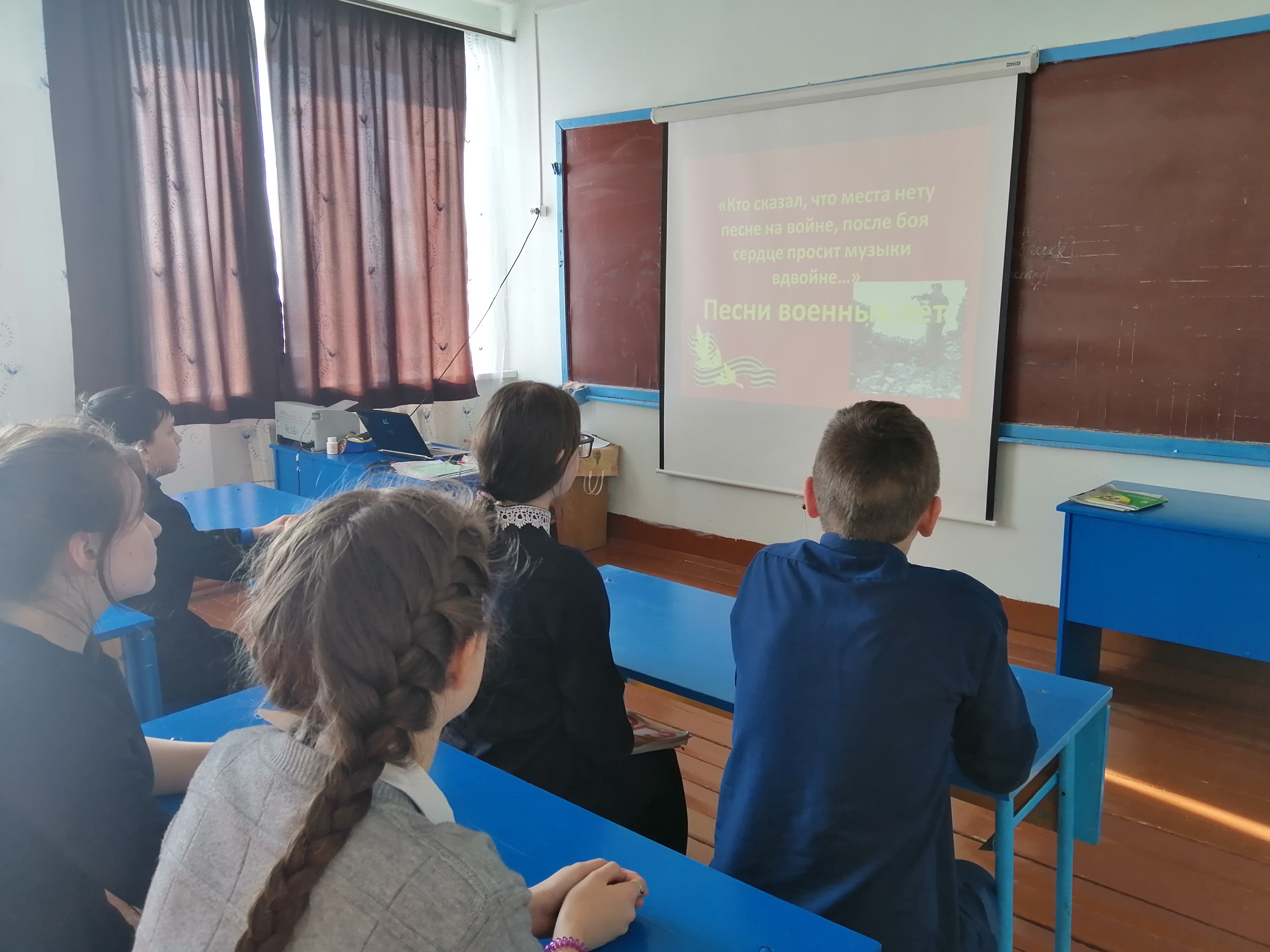 Мы говорили о песнях Великой Отечественной войны, об истории их создания, о том как они провожали наших солдат на фронт и встречали в освобожденных городах, о том, как поднимали в бой и помогали пережить потерю близких, шагали вместе с пехотой и ехали с танкистами по пыльным дорогам войны, поднимались в небо на крыльях с красными звездами и бороздили морские просторы. О песнях, которые помогли выжить и победить! И не только говорили, но и пели. Тюрин Никита спел песню «Священная война», девочки 8-9 классов спели песню «В землянке».