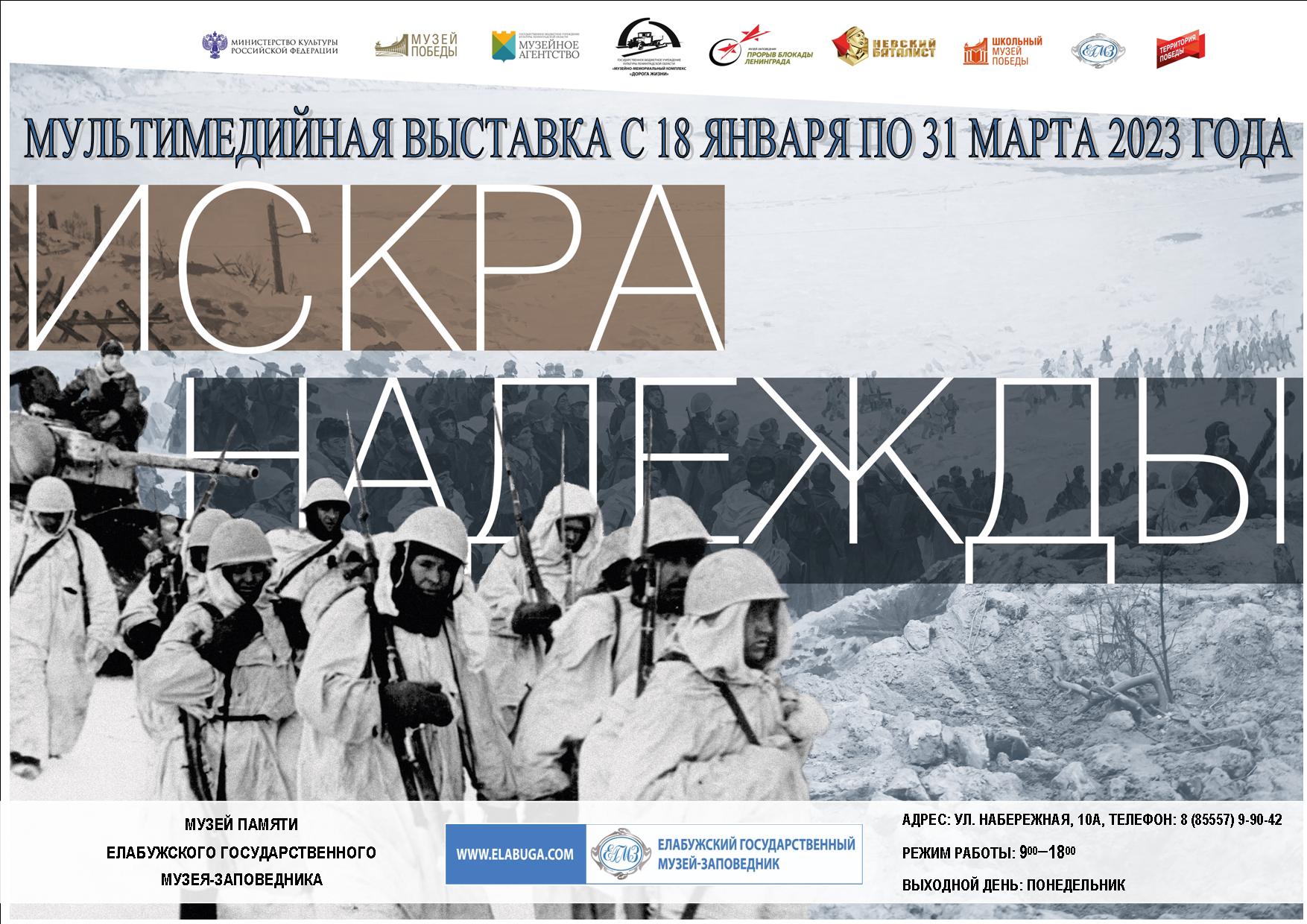 18 января в Музее Памяти Елабужского государственного музея-заповедника откроется первая мультимедийная выставка в 2023 году. Она посвящена важному и знаковому событию в жизни граждан нашей страны — прорыву блокады Ленинграда, состоявшемуся 18 января 1943 года. Операция «Искра», начавшаяся 12 января, завершилась прорывом блокады Ленинграда, когда войска Ленинградского и Волховского фронтов встретились в районе рабочих посёлков № 1 и № 5, преодолев последние километры немецкой обороны. В тот же день был полностью освобождён город Шлиссельбург, очищено от врага южное побережье Ладожского озера.