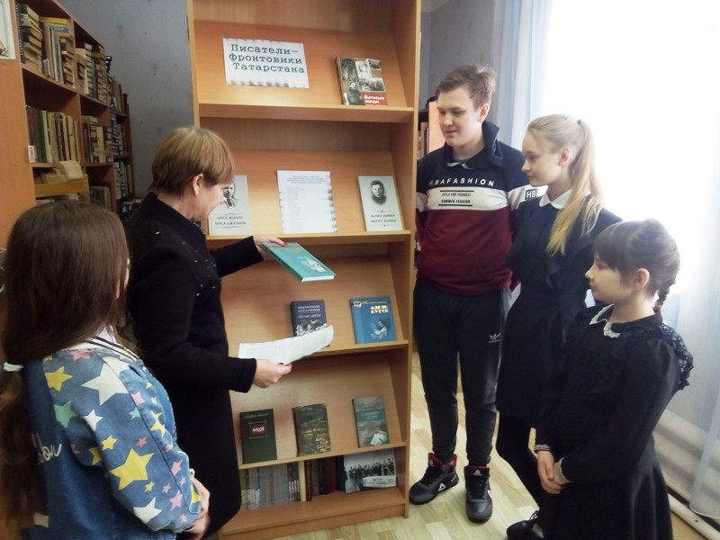 Библиотекарь Е.Шишова рассказала о писателях, которые с оружием в руках отстаивали независимость Родины. 25 человек из 53 членов Союза писателей Татарстана уже в первый военный год ушли на фронт: Муса Джалиль, Фатых Карим, Абдулла Алиш, Адель Кутуй, Сибгат Хаким, Наби Даули и др. Не все они смогли вернуться. Свои жизни за свободу Отечества отдали 30 писателей республики. Символом татарской поэзии военных лет по праву является имя Мусы Джалиля. В память о нем были прочитаны стихи из сборника его стихов.