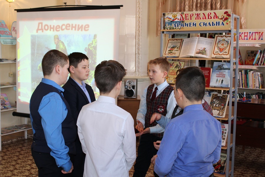 21 февраля, в преддверии Дня защитника Отечества, в Детской библиотеке прошла познавательная игра "Наша армия сильна – охраняет мир она". Активное участие в программе приняли ученики 5 "Б" класса МБОУ «Тетюшская СОШ №2» (классный руководитель Андрианова А.Е.). Команда мальчиков прошла через все испытания солдатской жизни. Для того чтобы проверить знания и смекалку, будущие воины ответили на вопросы военного теста «Перестрелка», «Донесение», «Воинская мудрость», а ловкость и быстроту проявили в конкурсных заданиях «Сбор по тревоге», «Маскировка», «Гранаты», «Солдатский борщ».
