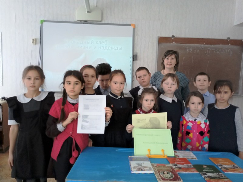 Библиотекарь рассказала о тяжелых днях блокады Ленинграда, о героизме и стойкости его жителей, о спасительной «дороге жизни» через Ладожское озеро. Хлеб, который состоял из пищевой целлюлозы, жмыха, обойной пыли, выбойки из мешков для муки, хвои и ржаной обойной муки крупного помола, трудно было назвать хлебом. Но для жителей блокадного Ленинграда он был очень долгожданным и вкусным. Рассказ сопровождался показом слайдов «Блокадный хлеб: символ жизни и надежды». Ребята зачитывали отрывки из воспоминаний детей блокадного Ленинграда. Наглядно показали детям хлеб весом 125 гр. – норма блокадного хлеба иждивенцам и детям до 12 лет. Участникам мероприятия раздали кусочки хлеба – норму, которая выдавалась жителям осажденного города. В акции принимали участие ребята 3 и 4 классов.